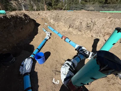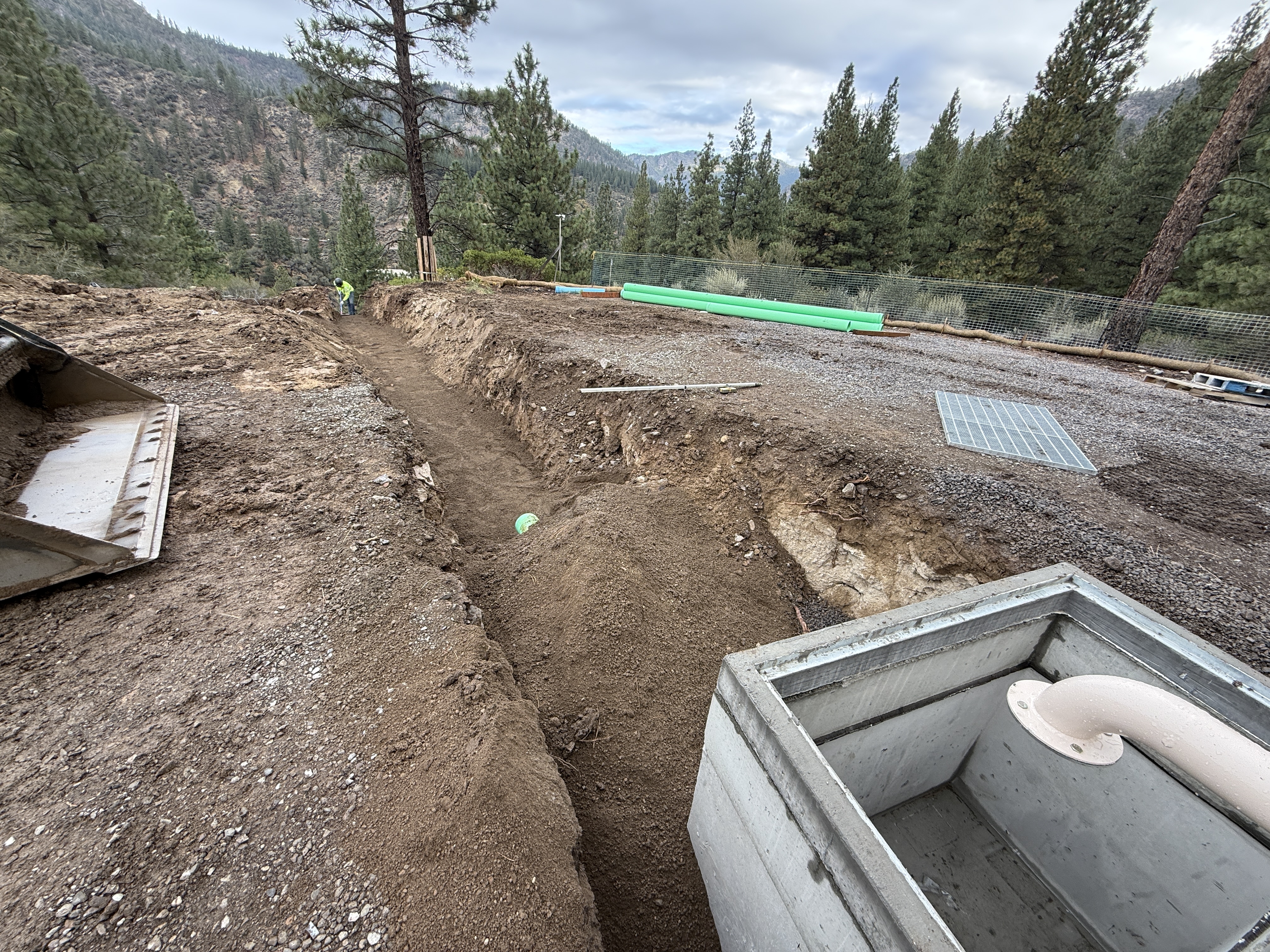 The image shows a trench being excavated on a slope in a forested area, likely for a water infrastructure project. A concrete vault with a pipe connection is visible in the foreground, and green pipes are staged nearby. An individual wearing construction PPE is seen working further along the trench. Equipment includes a large bucket, possibly from an excavator or backhoe.