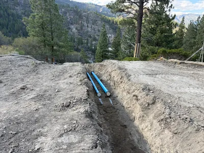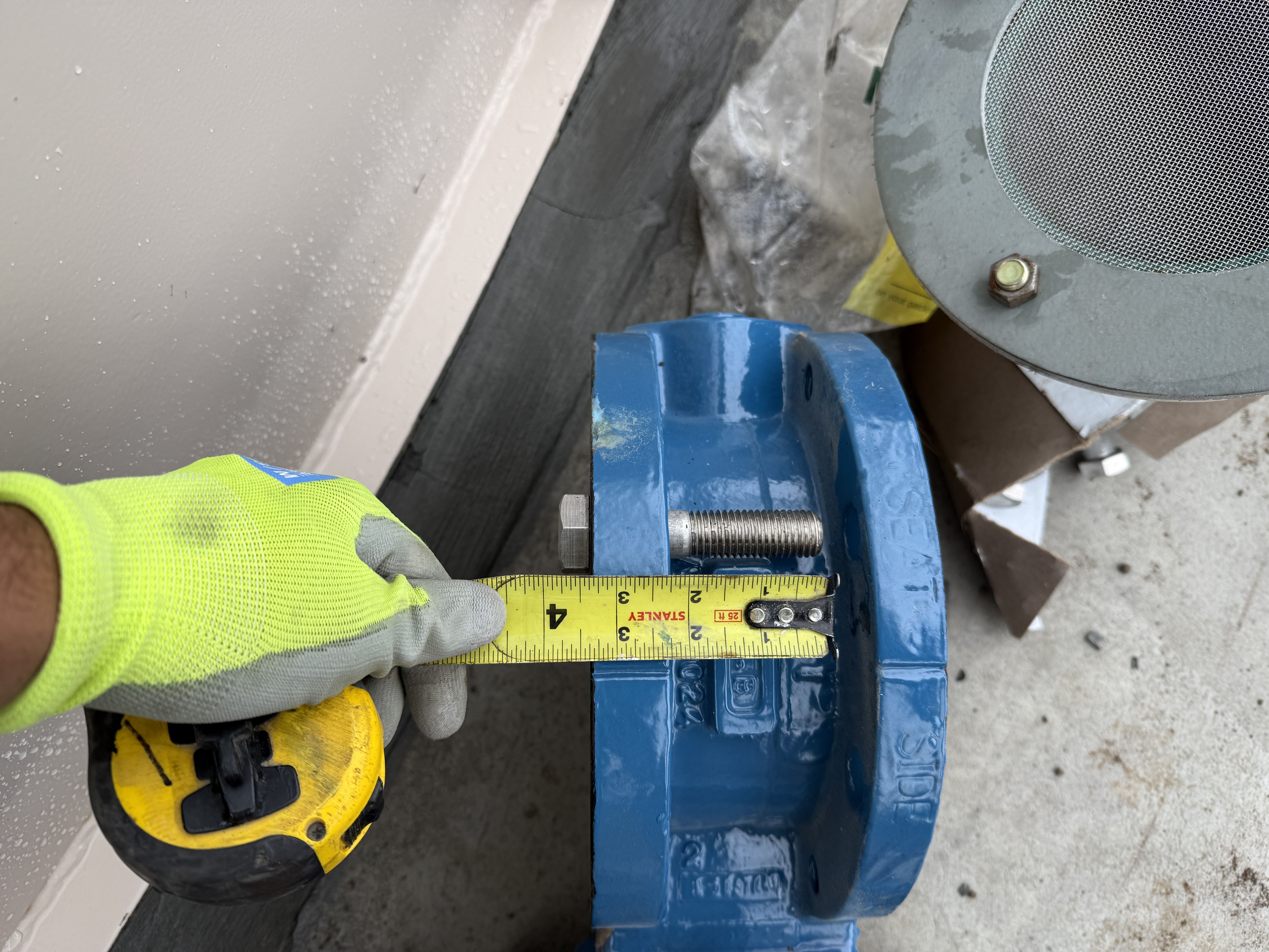The image shows a close-up of a person measuring a blue flange with a yellow tape measure. The flange appears to be part of a finished water tank system. The worker is wearing a hi-vis glove. Surrounding the flange are other components and potential mechanical parts.