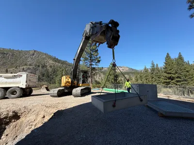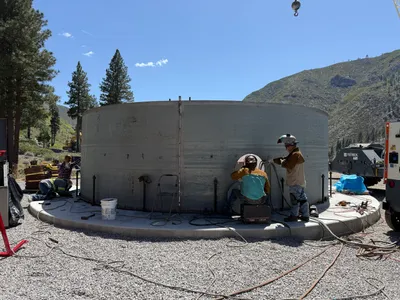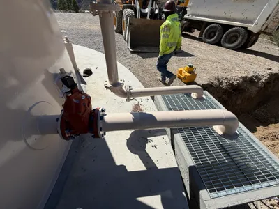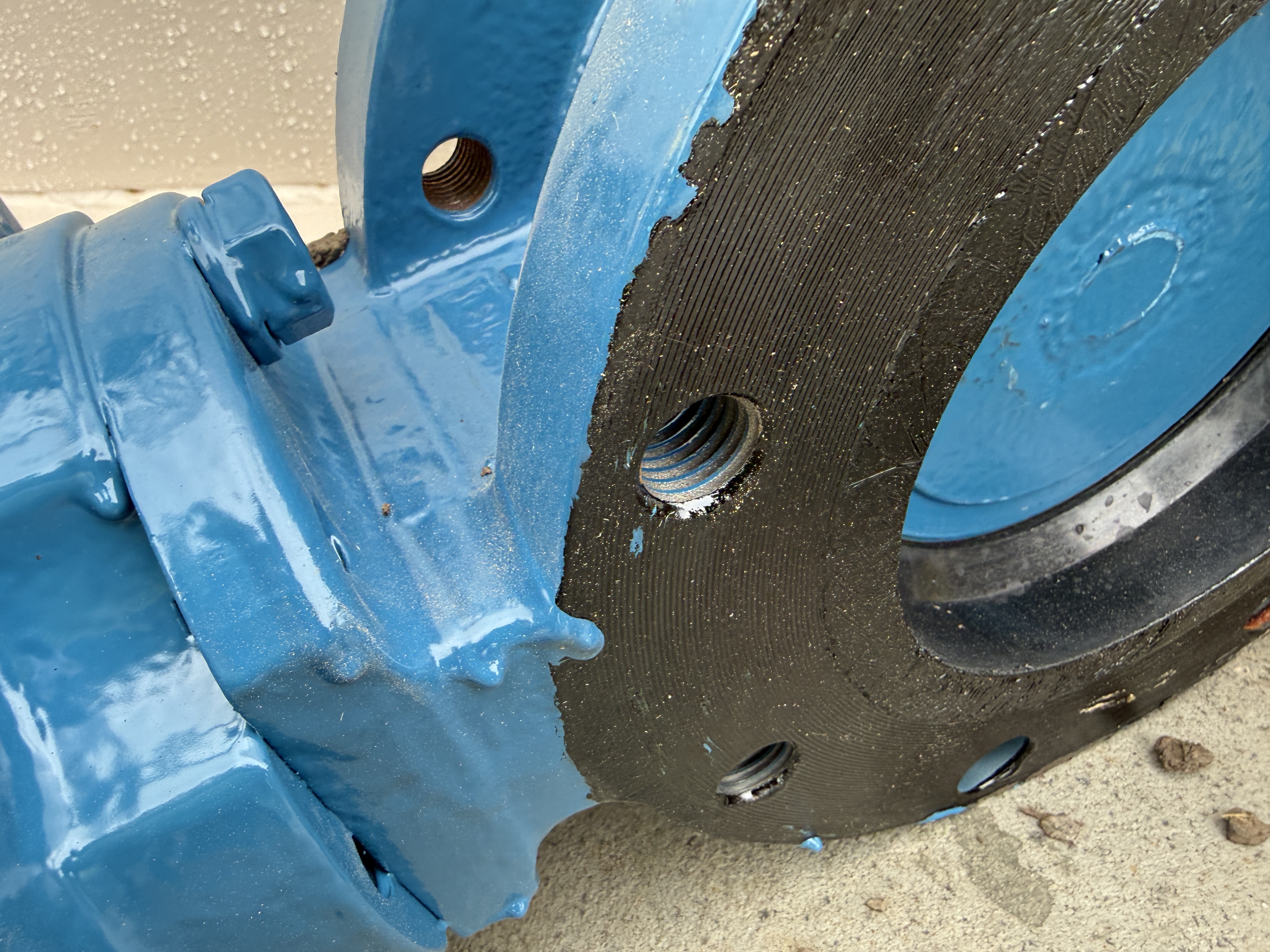 The image displays a blue-painted mechanical component which appears to be part of a larger assembly, featuring multiple threaded holes and a flange. There is a visible bolt on the left side. The painted surface suggests recent handling or installation activity. The component rests on a concrete surface.