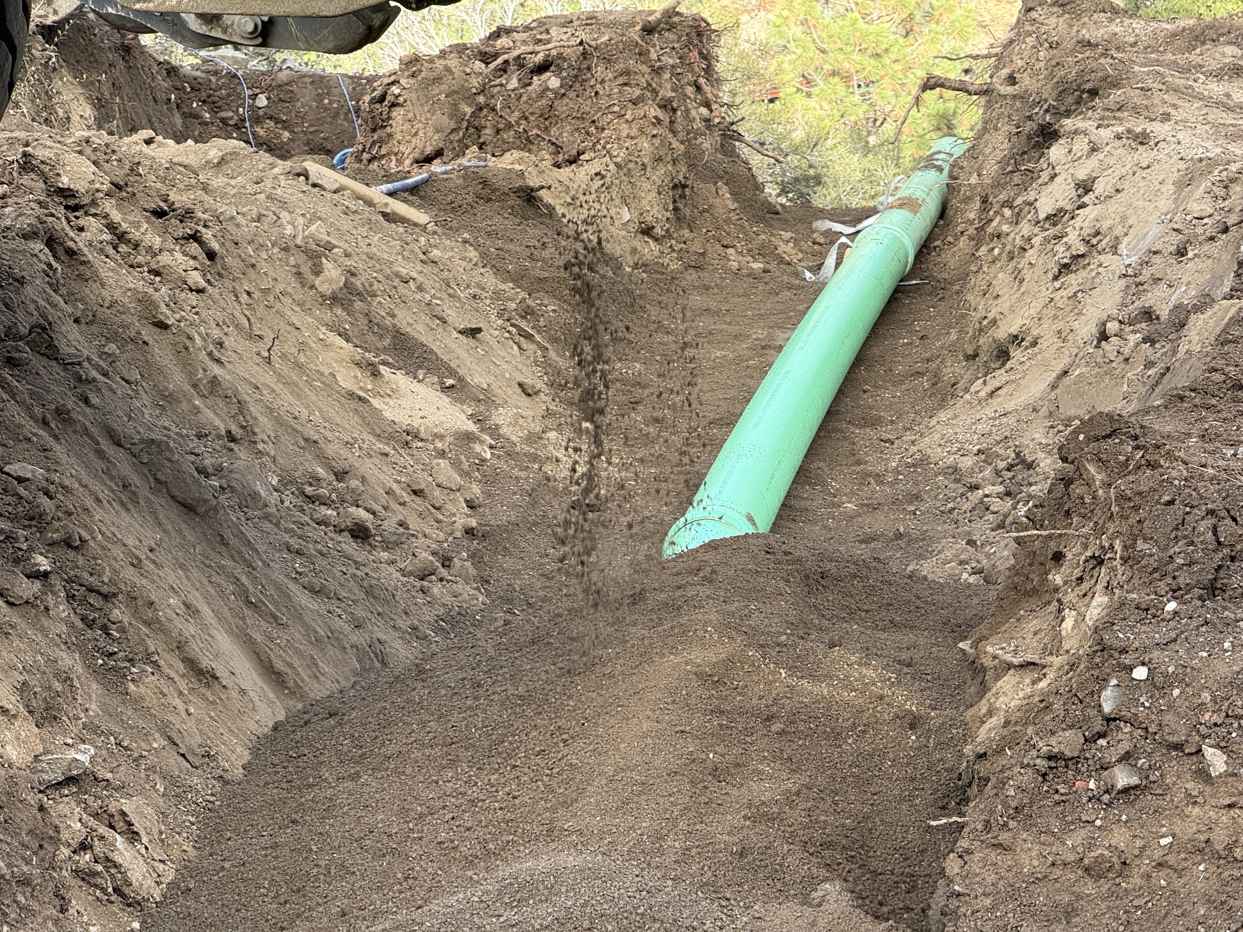 The image shows a green pipeline laid at the bottom of a trench with soil being used to backfill around it. The pipeline runs horizontally from the bottom to the top of the image, and loose earth is seen around and partially covering the pipe. There is no visible machinery directly interacting with the pipe, but a part of an excavator or loader can be seen at the top-left corner, suggesting soil movement activity.