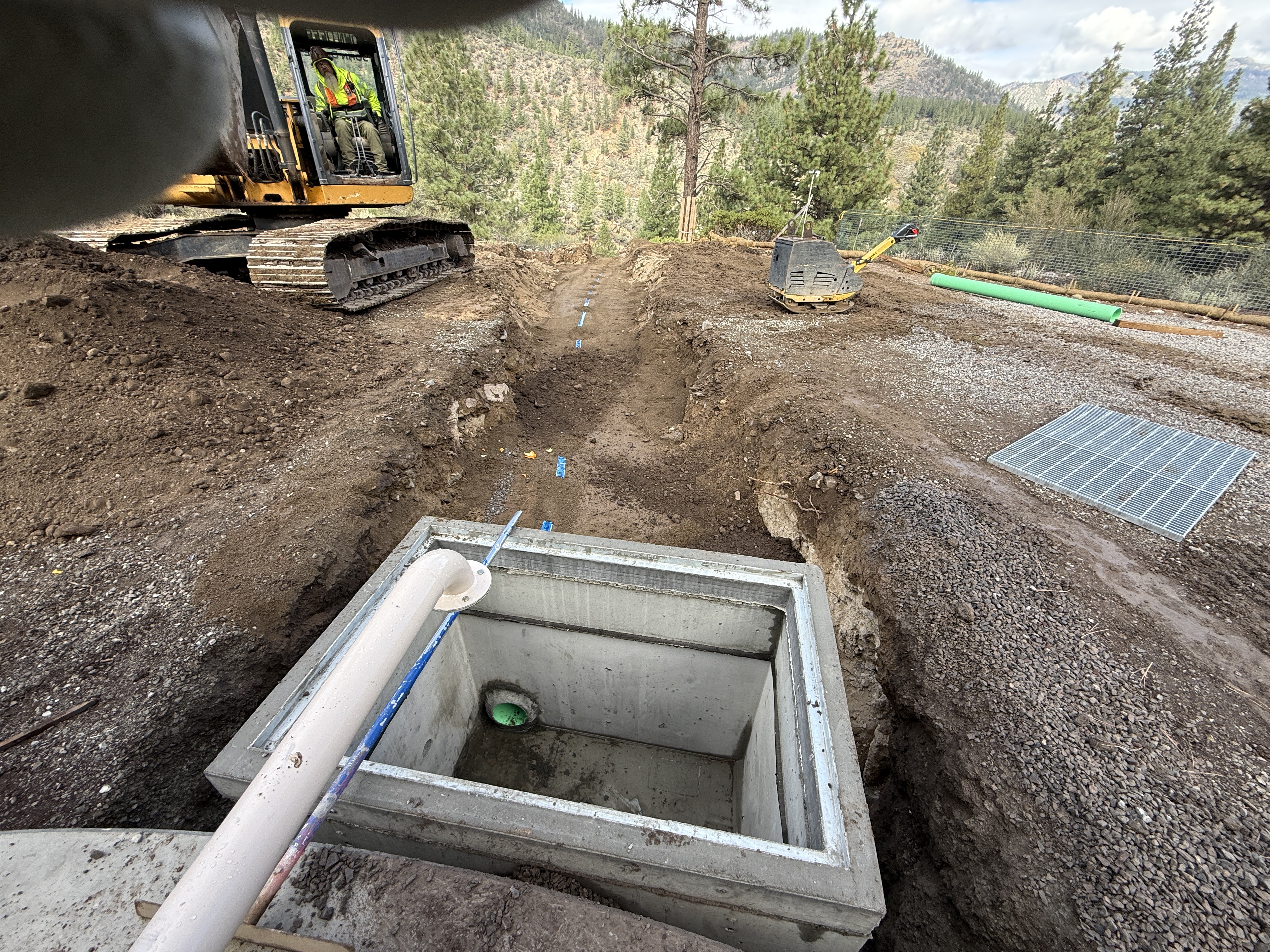 The image shows trenching activities at a construction site, with an excavator positioned to the left and a trench running across the ground. A concrete chamber appears to be installed in the trench with a pipe connection visible. The surrounding area is earth and gravel, with a compactor placed nearby. The site is located in a wooded area with a mountain backdrop.