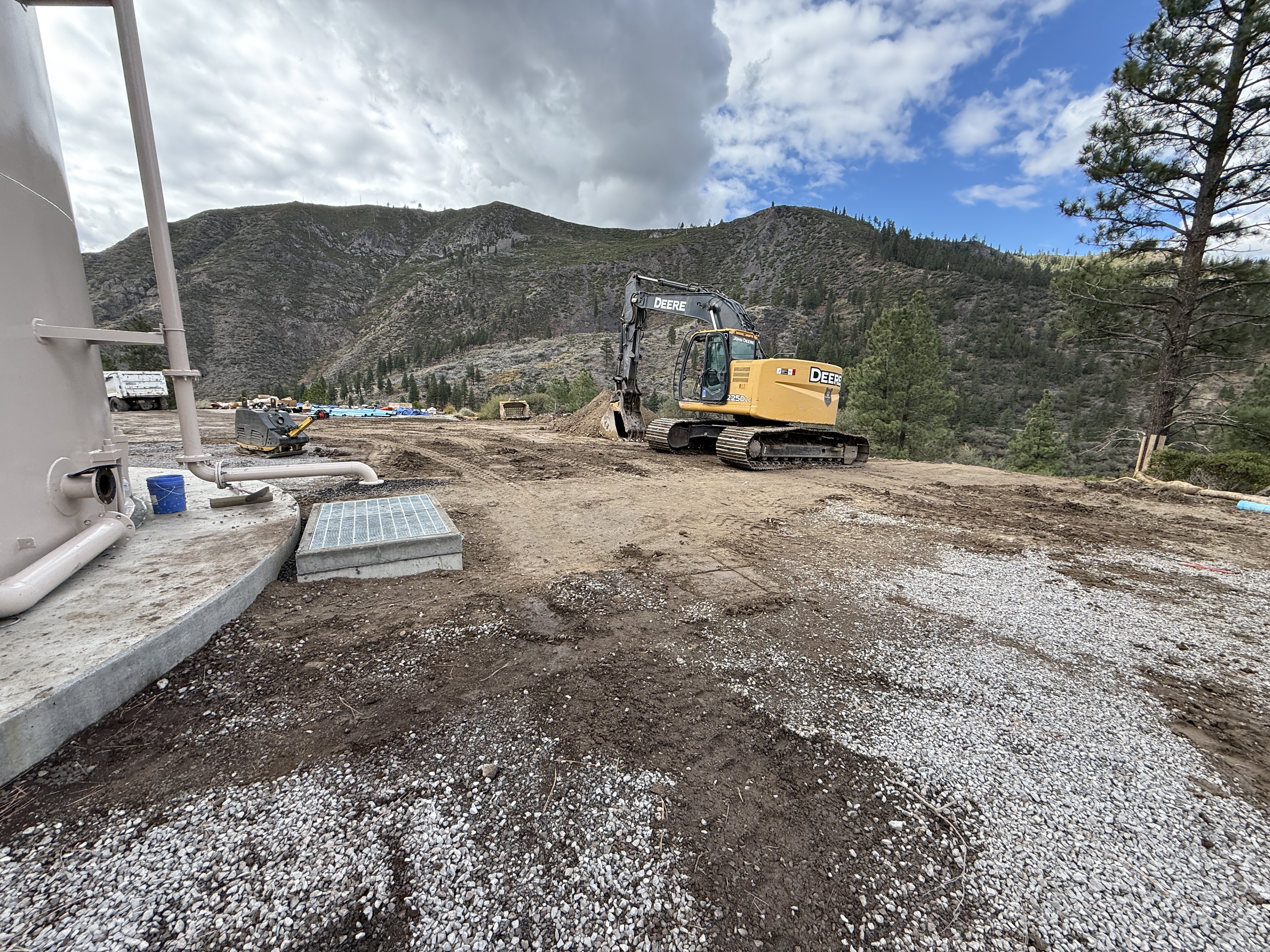 The image shows an area where site grading and excavation appear to be taking place. A yellow excavator is positioned centrally on the dirt surface, near a cylindrical structure with piping. Gravel and bare soil are visible at the site, suggesting ongoing groundwork. The environment is mountainous with visible trees, indicating a remote or rural location.
