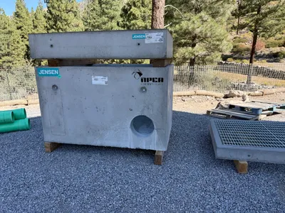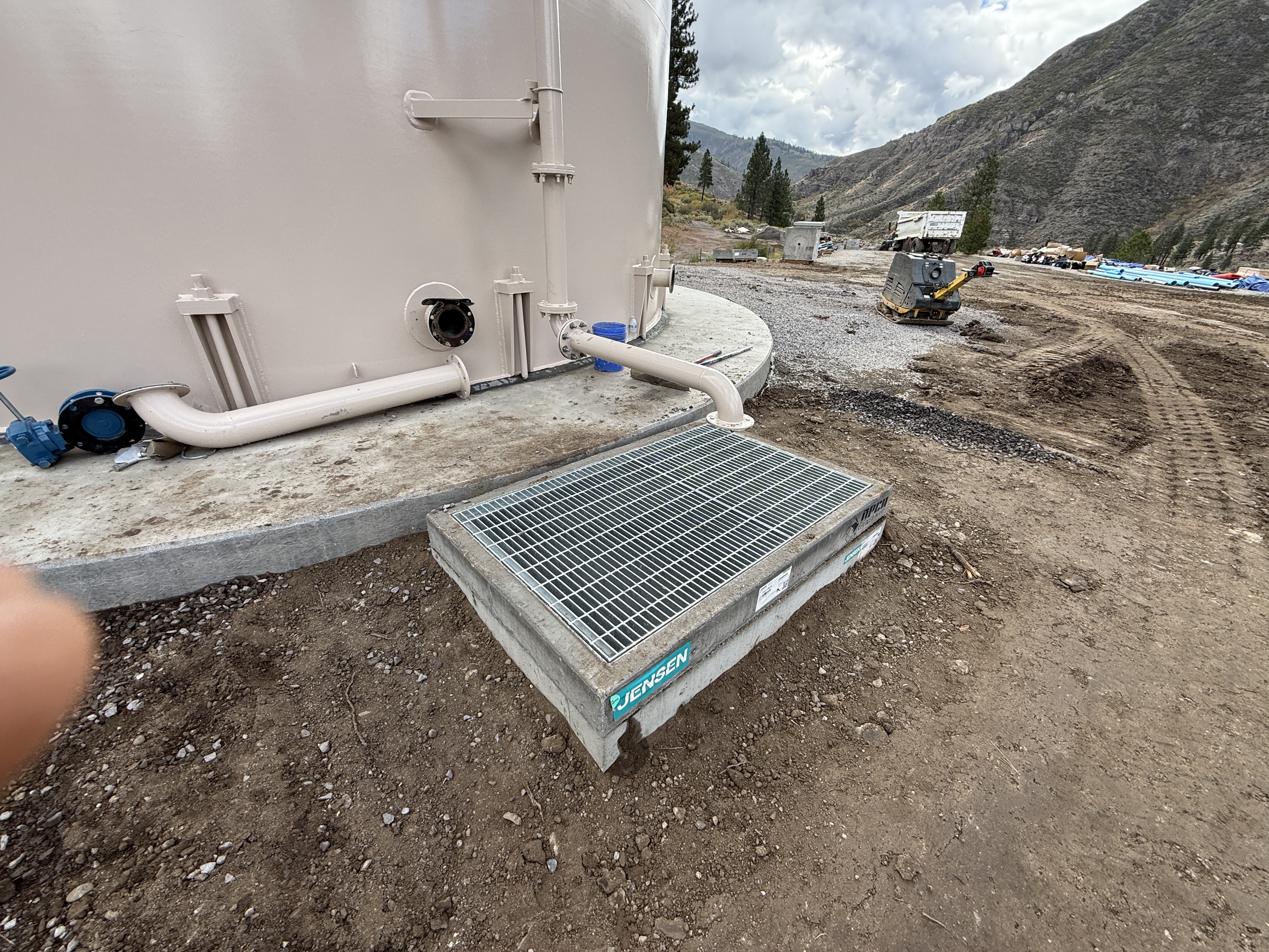 The image shows a finished water tank with several pipes connected to it, including one leading to an overflow drain covered by a grate. The area around the tank has loose soil and gravel, indicating recent site work. A piece of construction equipment is visible in the background, suggesting active construction activity.