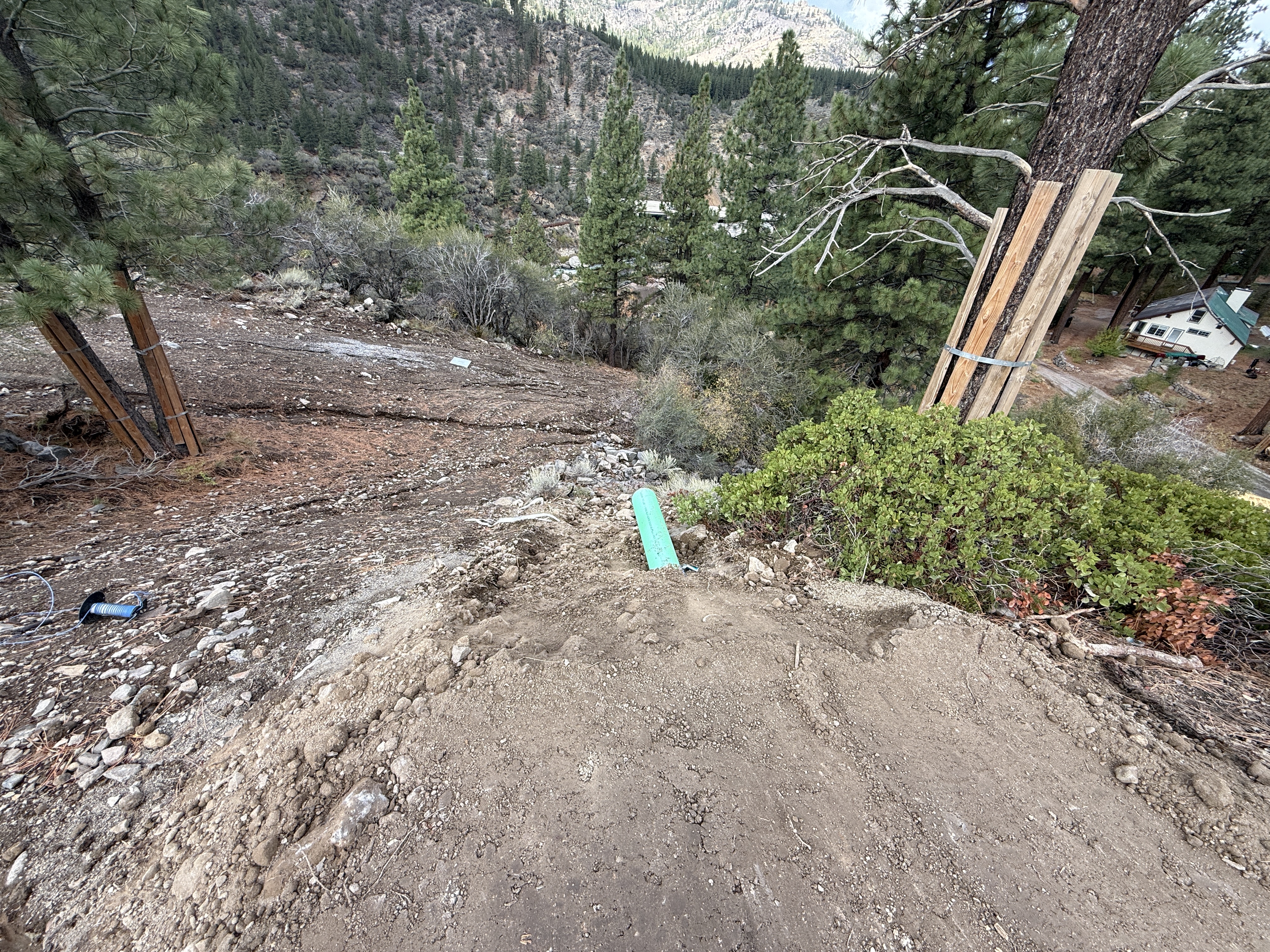 The image shows a hillside area with evident site grading taking place. There is a dirt path with soil spread unevenly around the area. Wooden braces are fixed to trees to provide support on the slope. No workers or machinery are visible in the image.
