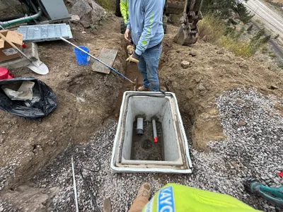 The image shows a backhoe loader depositing soil into an open trench. A person nearby is utilizing a manual tool, possibly for measurement or compaction. There is gravel visible on one side of a concrete structure, possibly a valve vault or another utility box. The setting appears to be an outdoor area with visible trees and uneven terrain.