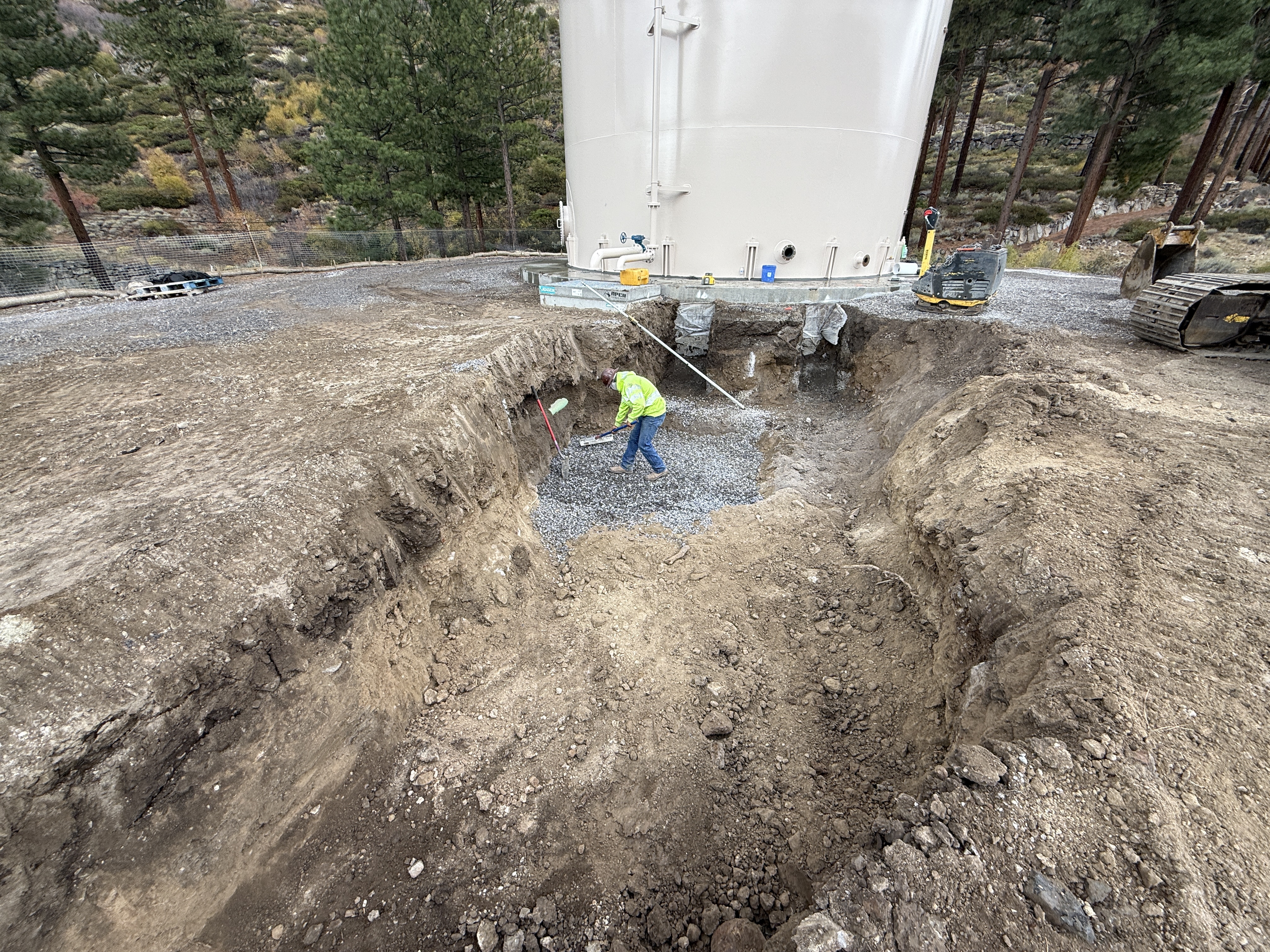 The image shows a worker in a trench near a large finished water tank, using a hand tool to manage gravel within the trench. A piece of heavy machinery is visible on the right side, suggesting site excavation or trenching is taking place. The image location is outdoors, with trees in the background indicating a possibly wooded area. This work is occurring near the finished water tank structure.