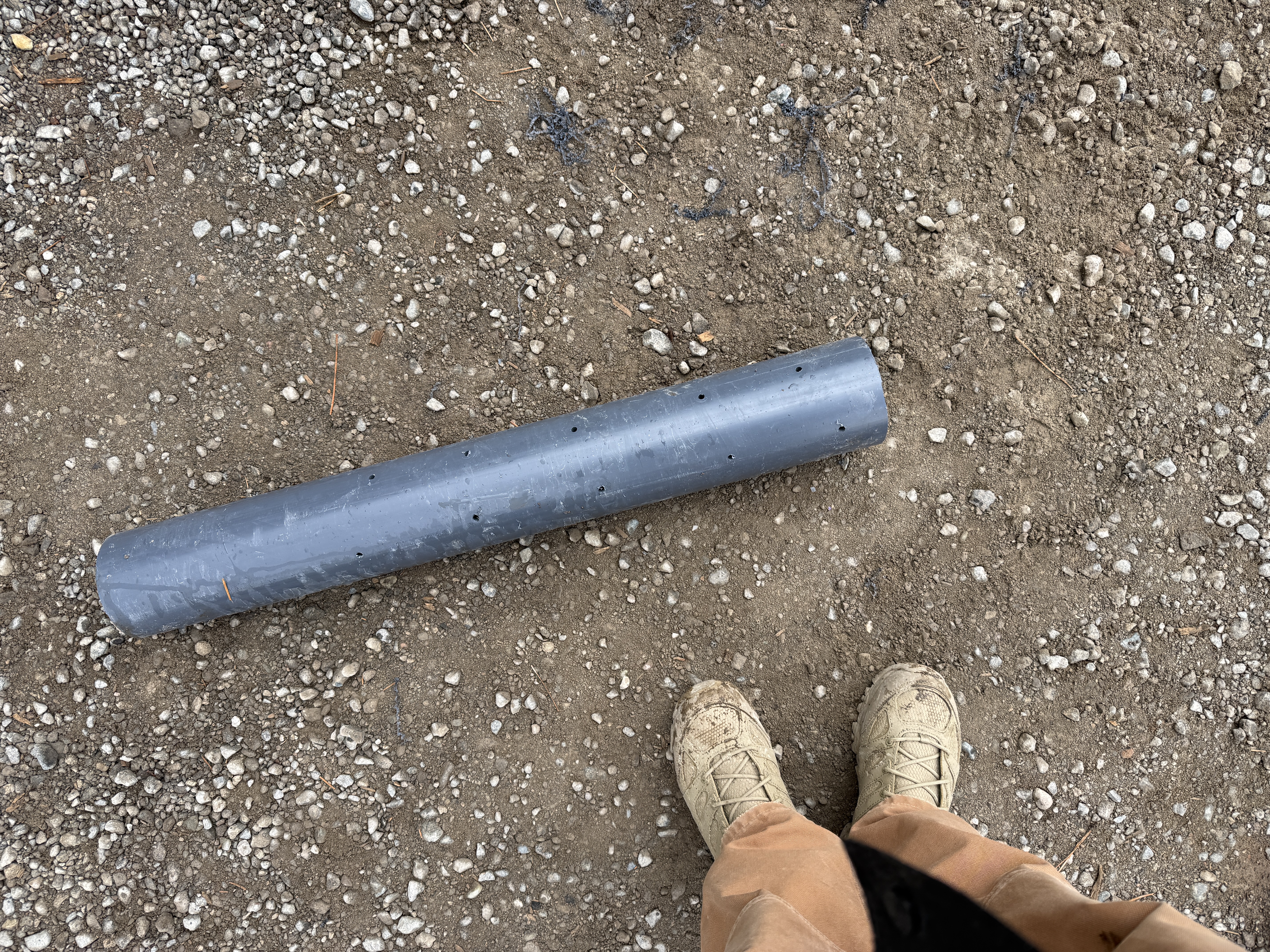 The image shows a cylindrical gray pipe section resting horizontally on a gravel and dirt site. It is positioned next to a pair of work boots worn by a person standing nearby. The location appears to be an outdoor area without any visible ongoing work activities.