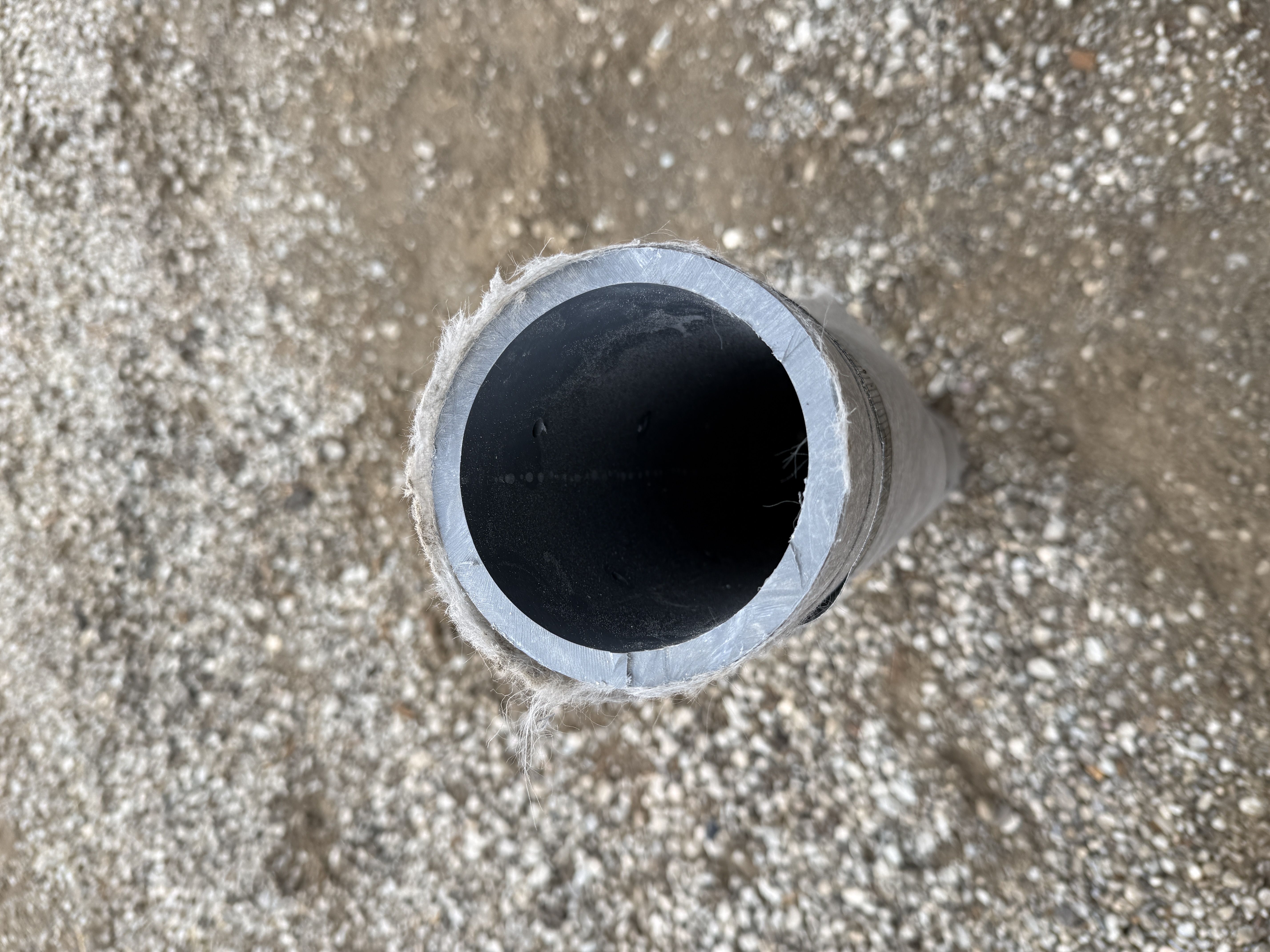 The image shows the top view of a vertical cylindrical pipe set outdoors on a gravel and dirt surface. The pipe is open at the top and has a visibly rough edge, suggesting it has been recently cut. There appears to be fibrous material or insulation around the rim. The surrounding context suggests utility work, possibly related to water flow management.