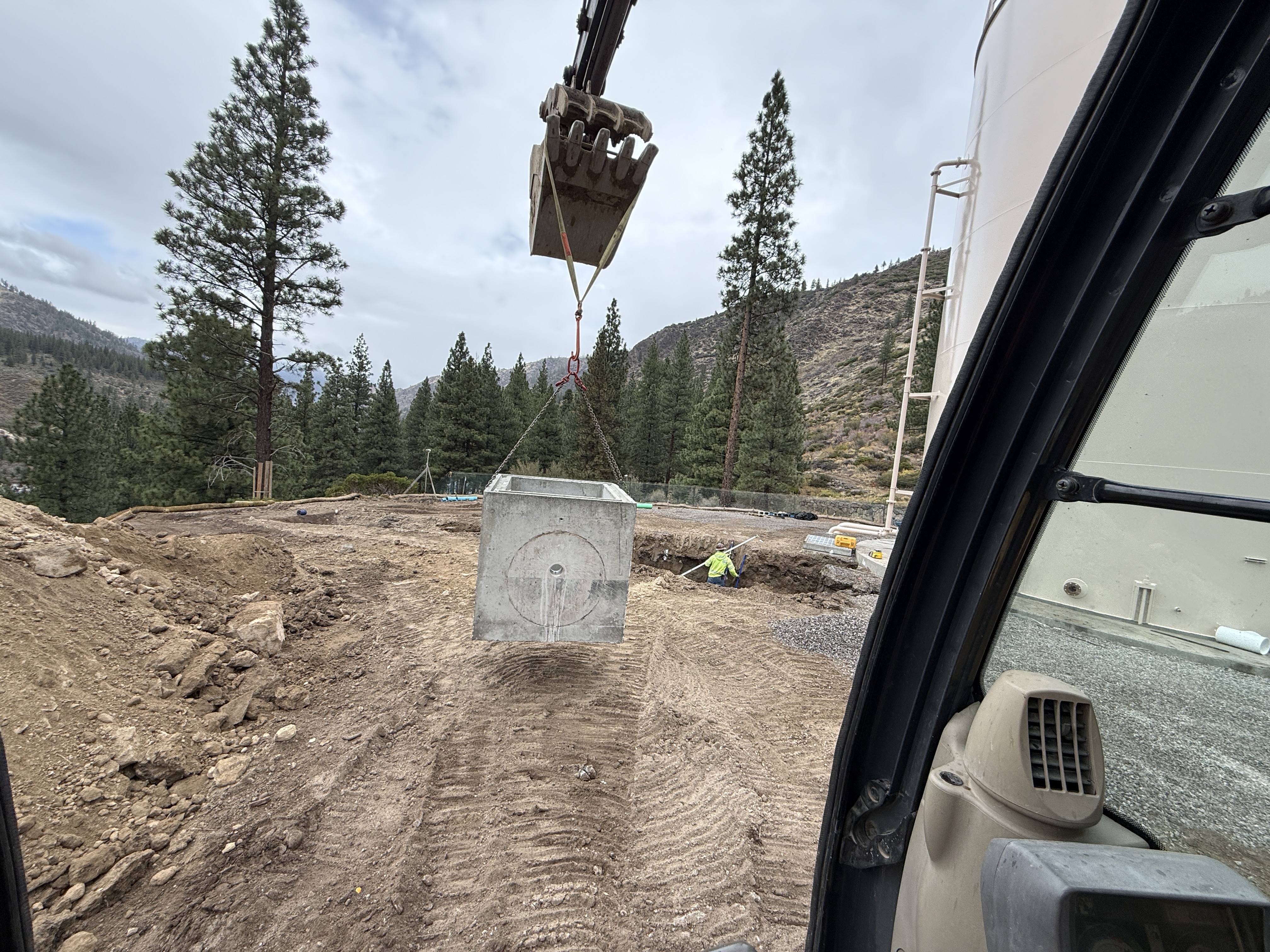 An excavator is lifting a concrete vault using slings in a wooded area. A worker in hi-vis clothing is nearby, and the site shows signs of recent earthwork. The area is surrounded by pine trees with visible mountains in the background.