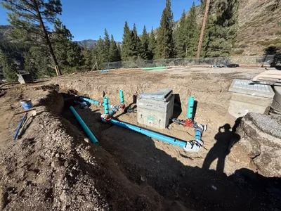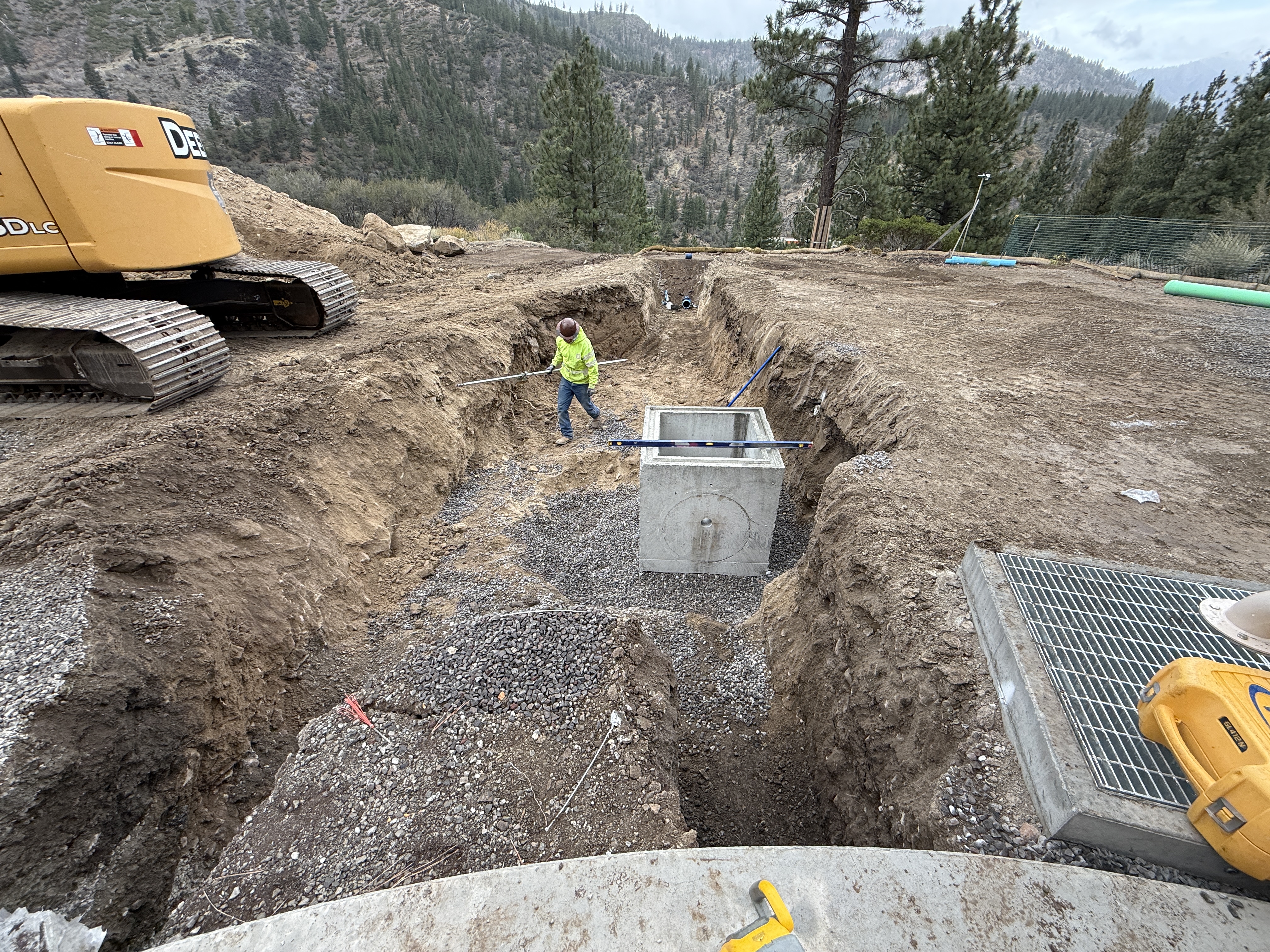 A worker in a trench is involved in installing a concrete flow meter valve vault. The trench contains gravel, and there is a large excavator parked nearby. The area is surrounded by a natural landscape with trees and mountains in the background. The presence of gravel and trench suggests site preparation and infrastructure work.