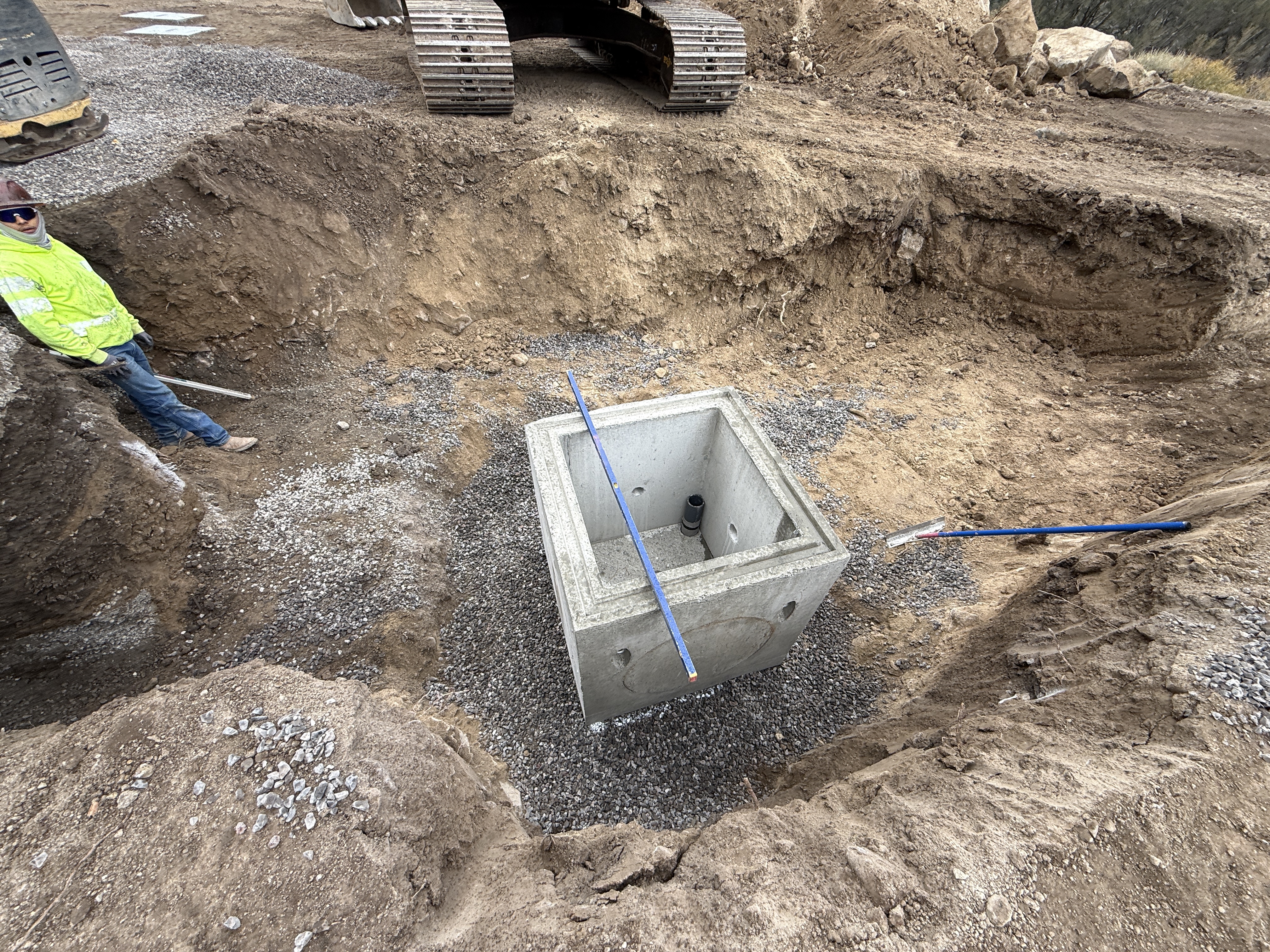 The image shows a concrete valve vault placed within an excavated trench. An excavator is visible at the top of the trench with its tracks on the right. A worker stands inside the trench, next to the vault. Gravel is used as bedding around the vault.