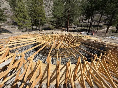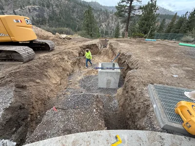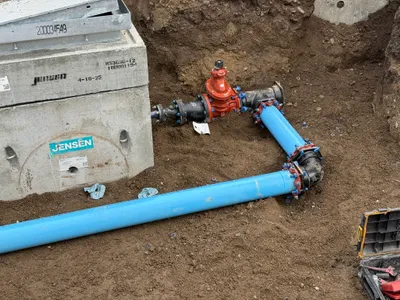 The image shows a red valve assembly with connecting pipes near a concrete wall opening. The valve assembly is partially buried in the soil, indicating installation within a utility vault or underground infrastructure. No active work personnel or machinery are visible in this frame.