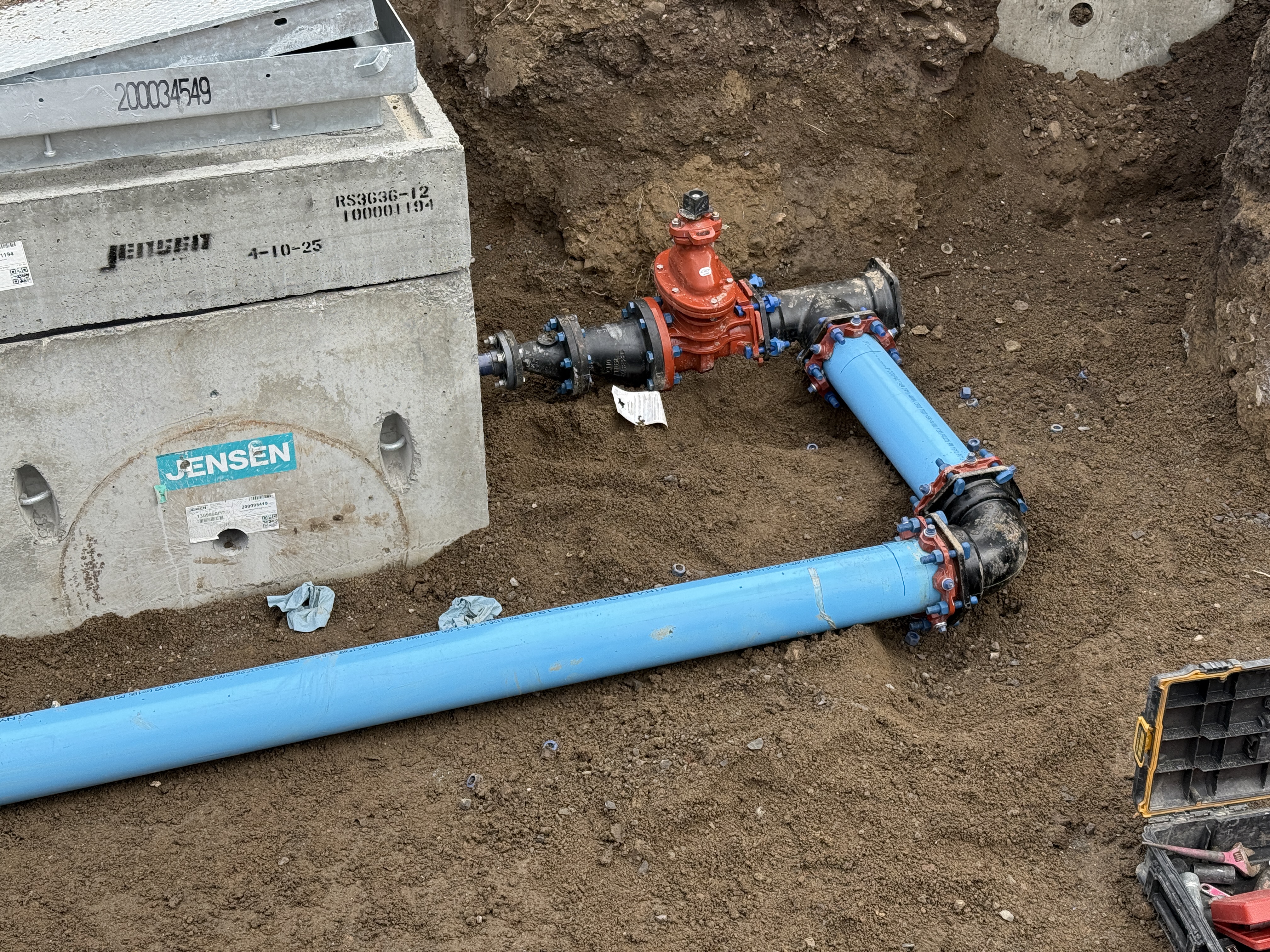 The image shows a valve assembly with blue pipes connected by flanges inside a valve vault area. The concrete housing is labeled with 'Jensen', and the piping includes a red valve fitting. The surrounding area reveals excavated soil, and a toolbox is visible, indicating ongoing work.
