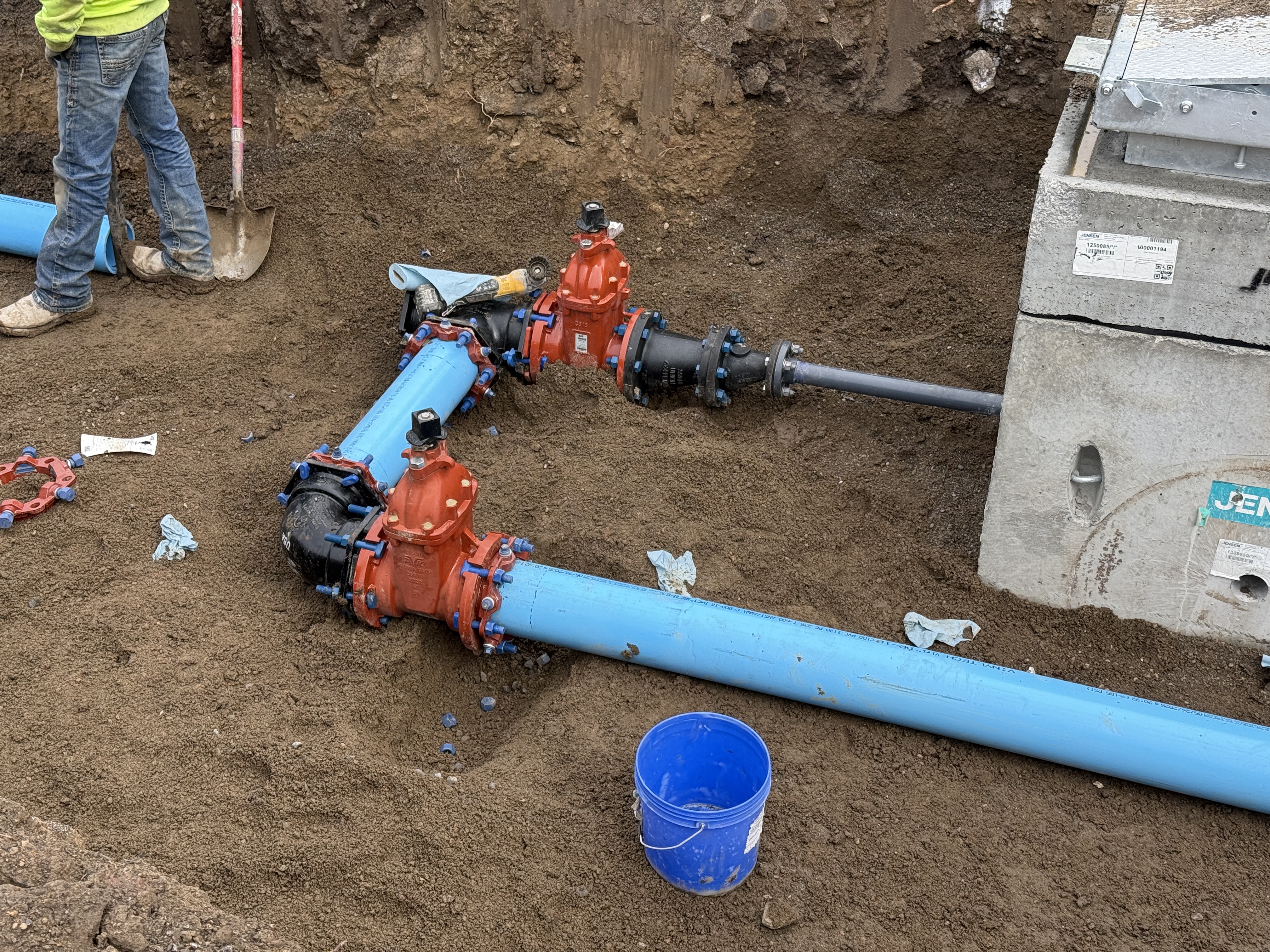 The image depicts a trench with multiple blue pipes connected to red valve assemblies. A worker stands to the left of the assembly holding a shovel. The setup includes a concrete vault to the right and additional fittings on the ground. The area appears to be part of a larger pipeline installation project.