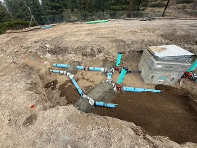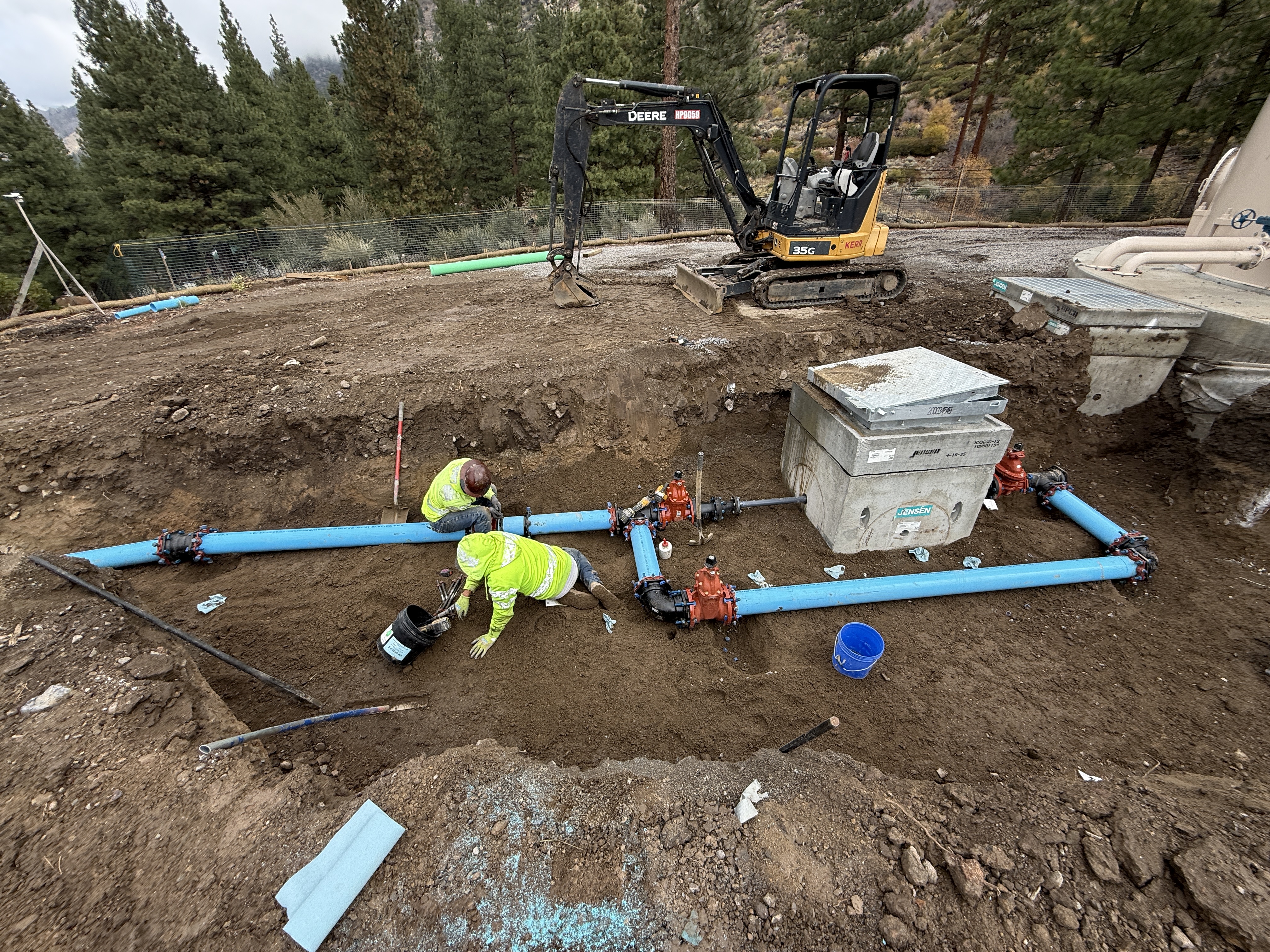 Two workers are positioned within a trench, working on what appears to be a valve vault installation with visible blue pipelines connecting to a concrete vault. A mini excavator is nearby, indicating recent or ongoing excavation work. The workers are wearing PPE, and the area is surrounded by trees with no visible barriers around the trench.