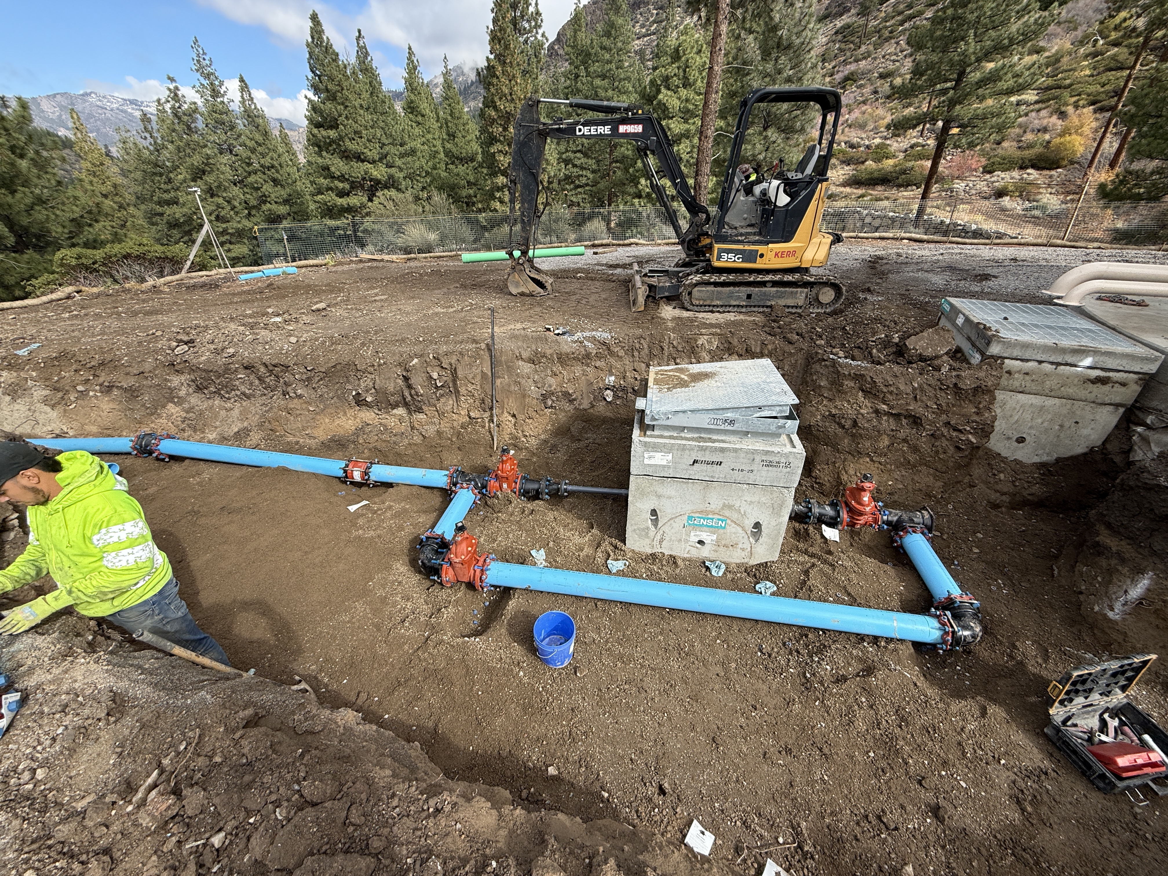The image shows a trench containing blue pipes connected with red valves. An excavator is parked nearby. A worker is visible in a hi-vis jacket, working in the trench. Several utility vaults are installed within the trench layout.