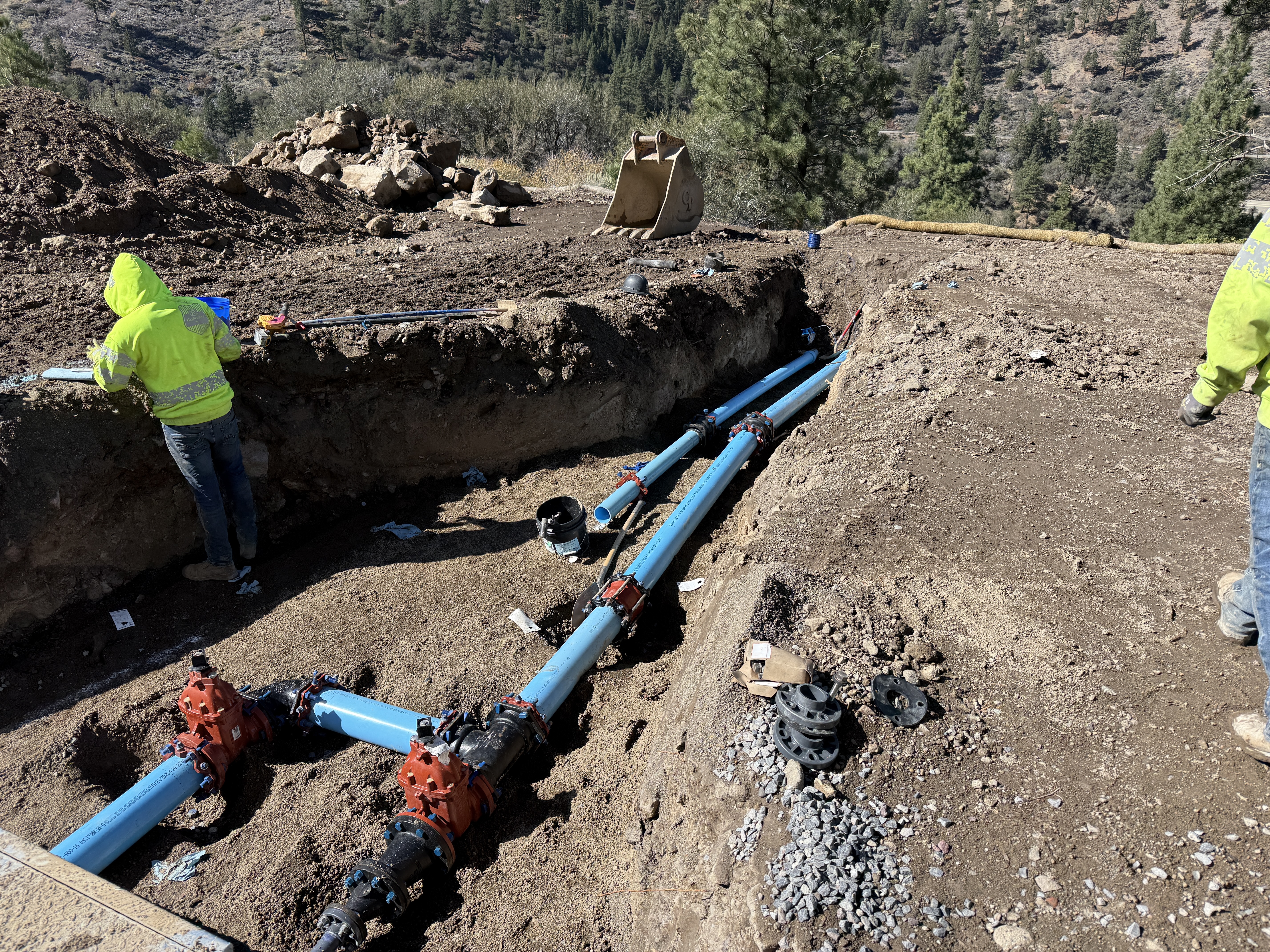 The image shows two workers in a trench working on installing blue pipelines. The trench has been dug in a rocky, soil area with some gravel present. Several red valves are attached to the blue pipes. The environment surrounds by trees indicating a remote or semi-remote location.