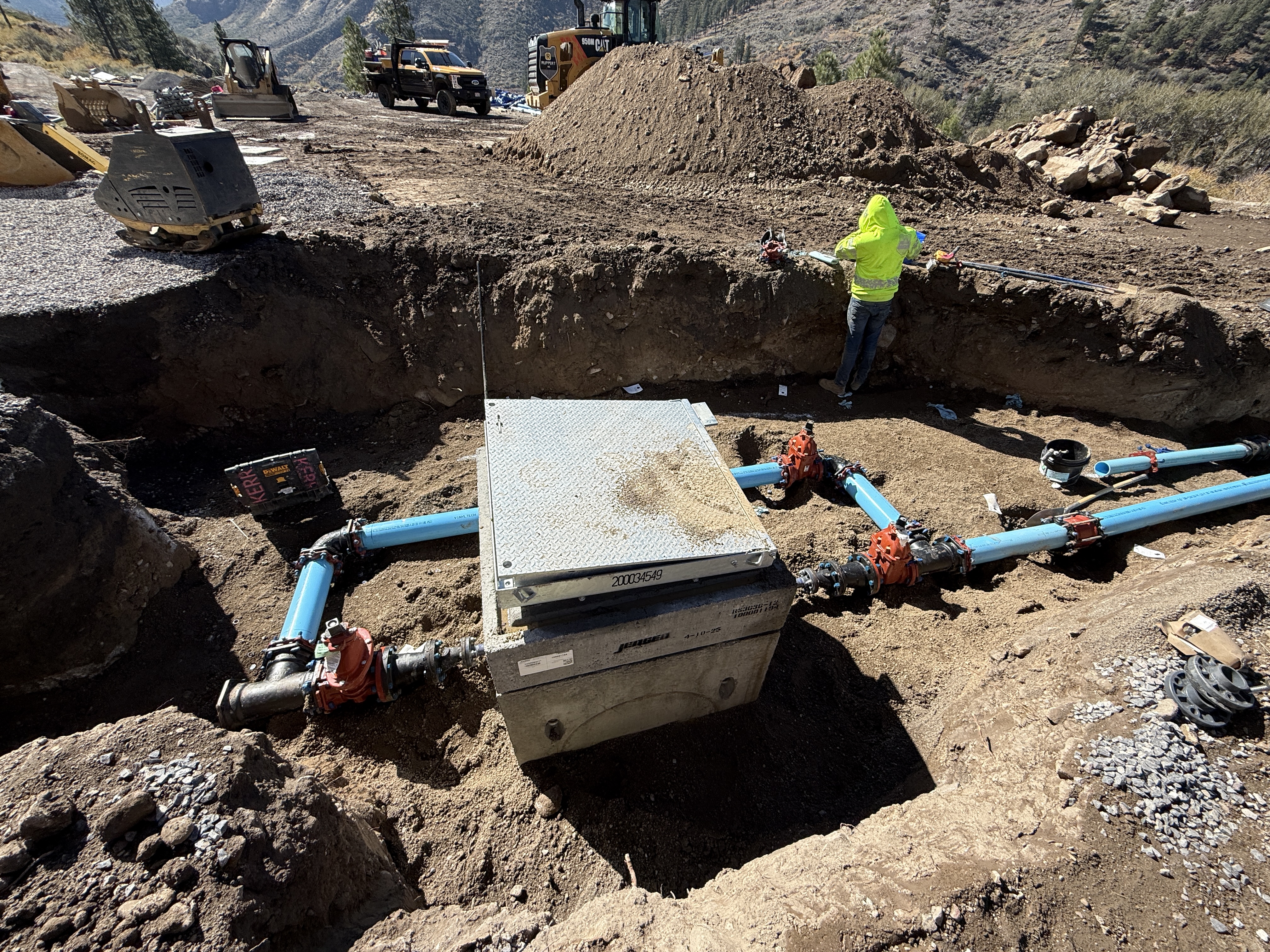 A worker is in a trench installing or adjusting pipeline components connected to a valve-vault. Blue pipes are connected to a central vault, with visible fittings and valves. Nearby, heavy equipment and vehicles are stationed on the site. The surrounding area includes uneven ground with open trenches, indicating recent excavation activities.