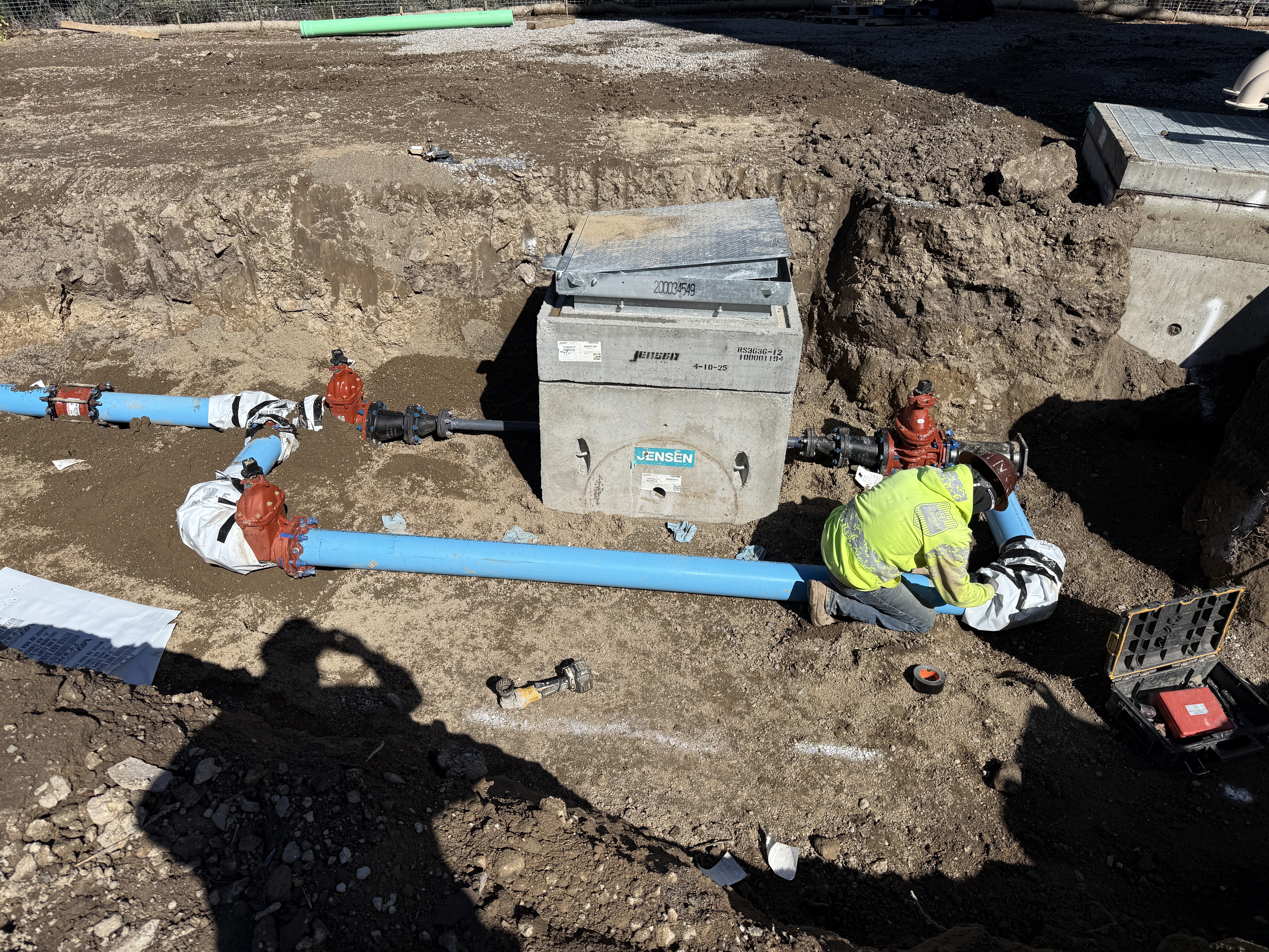 The image shows a worker in a trench assembling pipeline connections within a valve vault area. Blue pipes are connected to red valve assemblies. A concrete vault with 'JENSEN' labeling is present in the work area. The worker is wearing a hi-vis vest and is crouched next to the pipes, indicating active installation work is taking place.