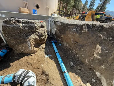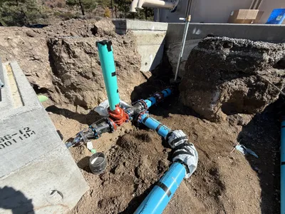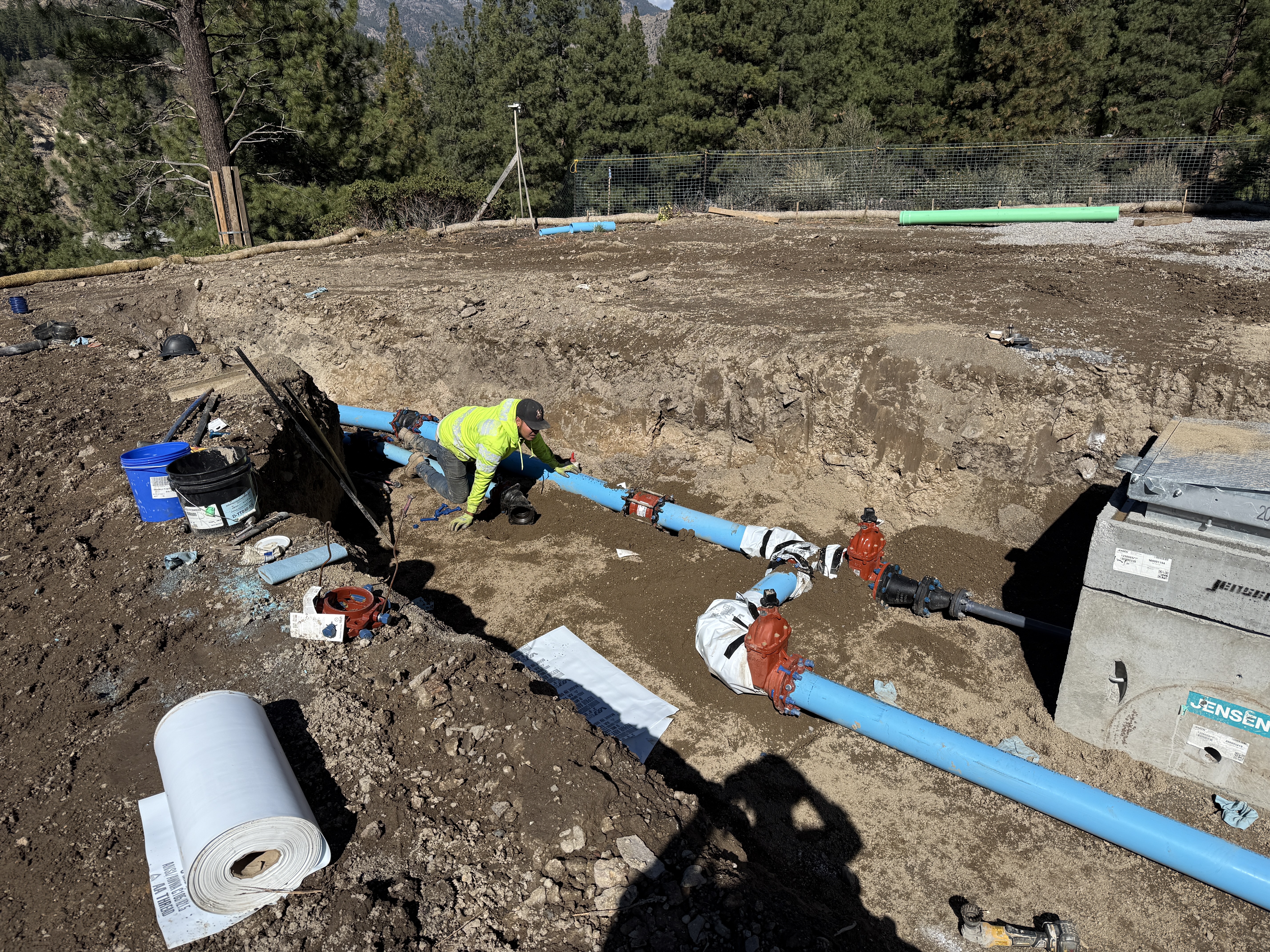 The image shows a worker in a trench working on a pipeline installation near a valve vault. The area is surrounded by dirt, and several blue pipes are connected with red valve assemblies. Construction materials and tools are scattered nearby, and the worker is wearing safety gear.