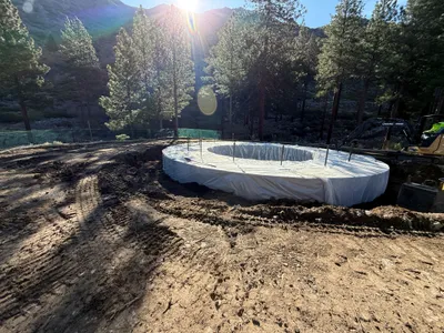 dirt and earth with open trench sunny, daylight materials staged near trench