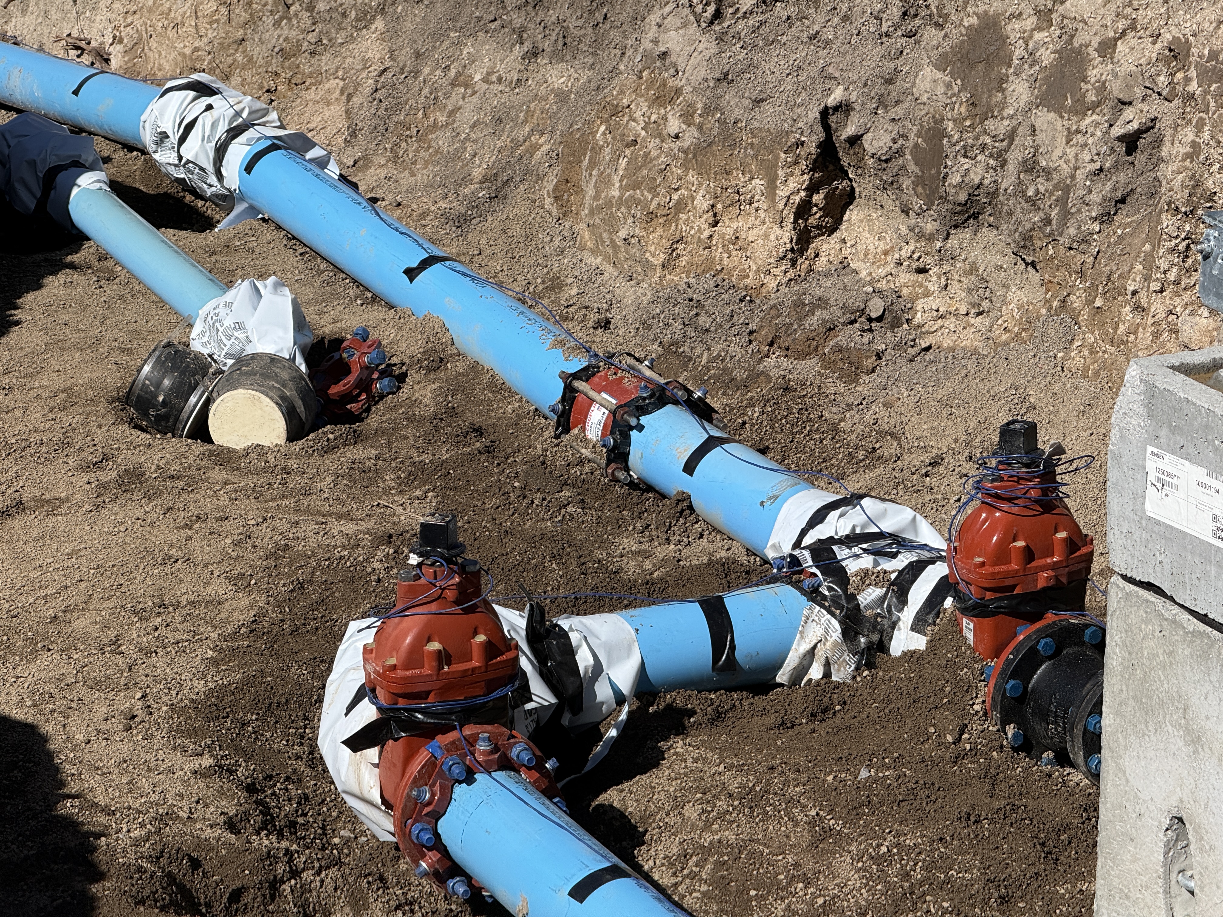 Pipelines are shown laid in an excavation trench with red valve assemblies at several connection points. The pipes are blue, and they are partially wrapped in white material at the joints and bends. The soil is visibly packed around the pipes, suggesting stabilization or preparation for backfilling.