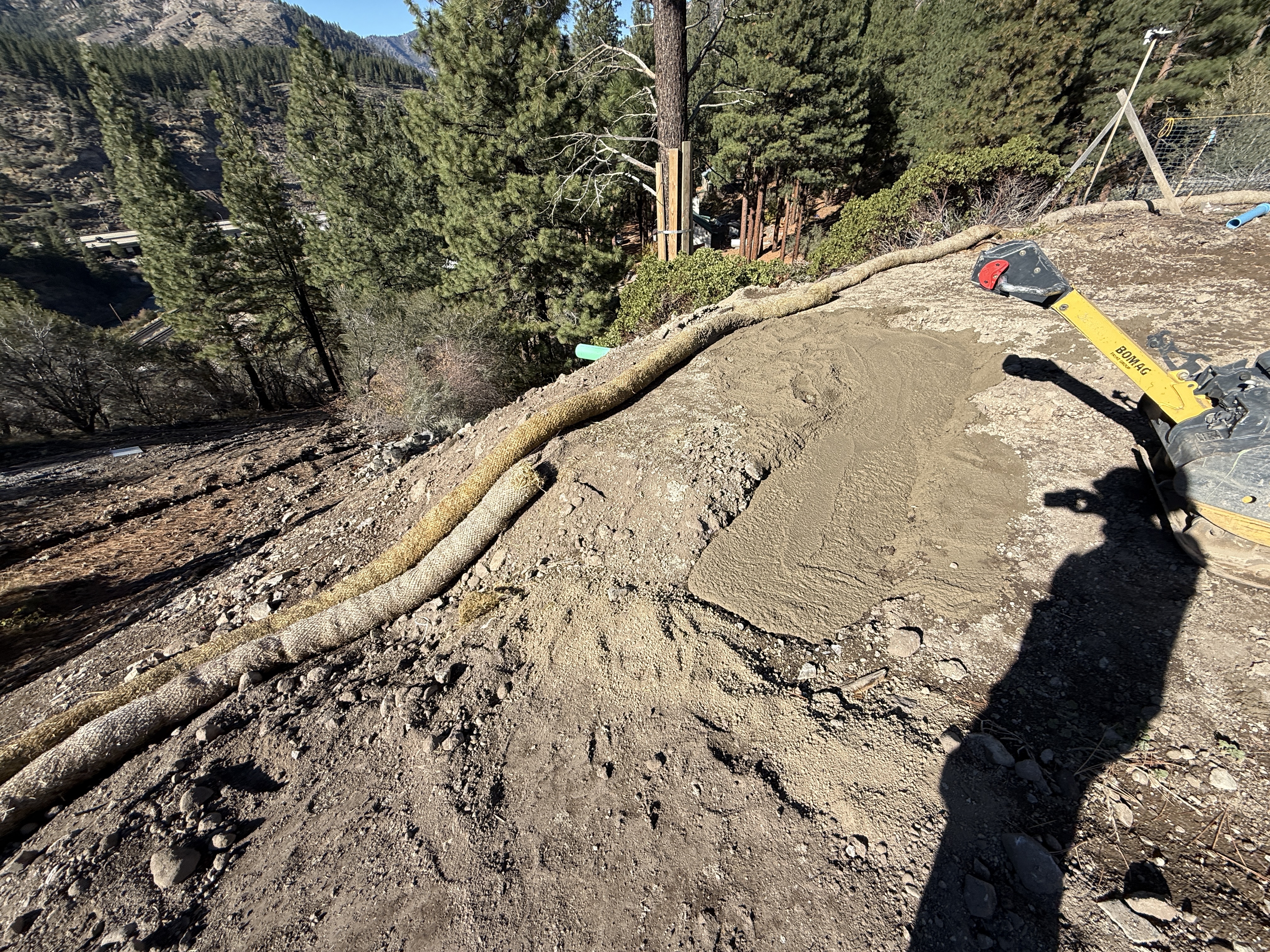 The image shows a site-grading operation on a sloped area with a compacted soil surface. A straw erosion control measure is laid parallel to the slope on the left. A vibratory plate compactor is present on the right side of the image. The area appears to be prepared for further construction work or surface stabilization.