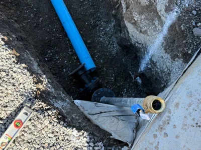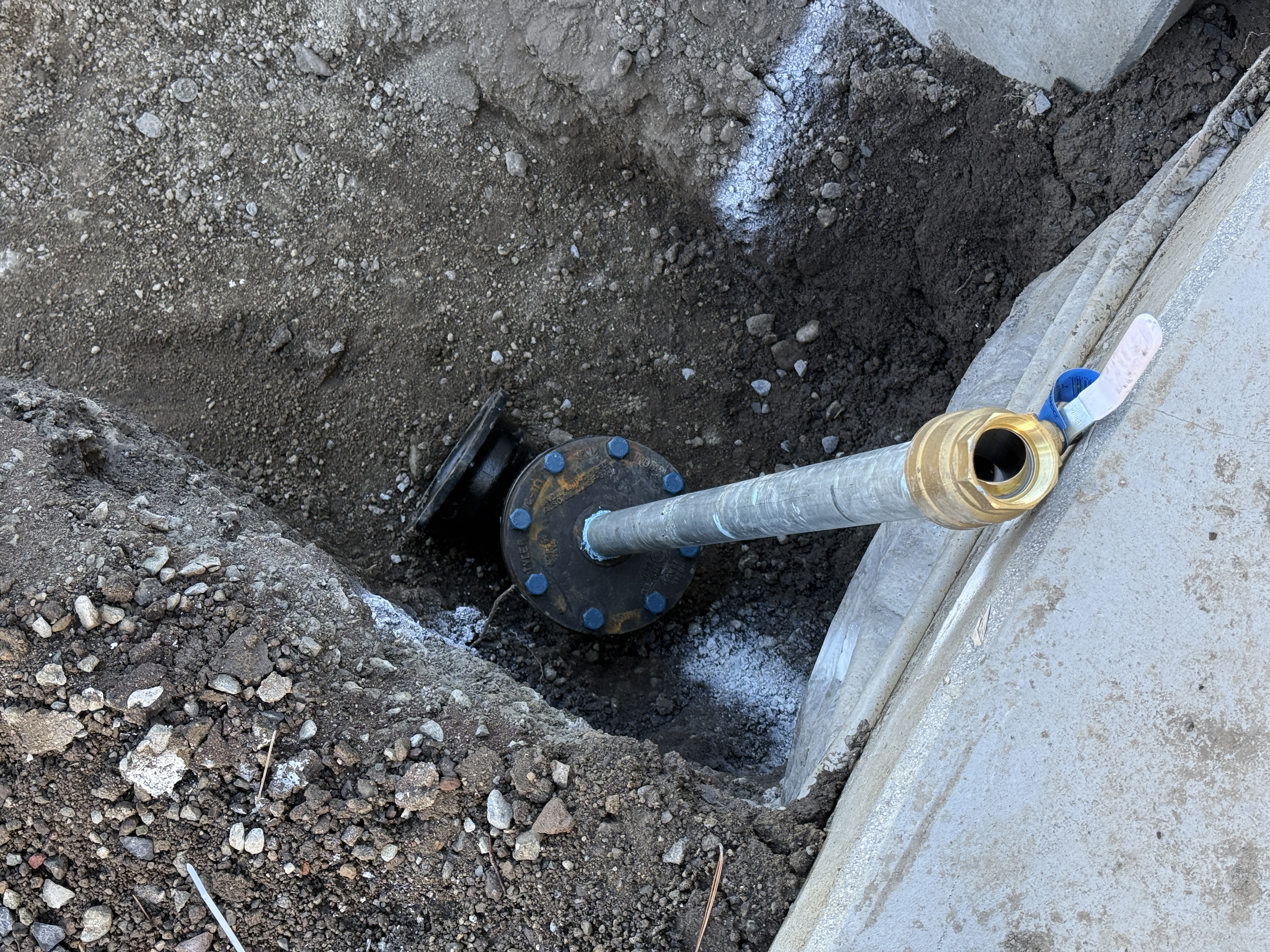 The image shows a metal pipeline running horizontally in a trench. The pipe is connected to a flange, and a brass valve with a blue handle is visible on the pipeline. The surrounding area consists of exposed soil and minimal concrete edging. The work appears to be related to installing or connecting the pipeline in the valve vault area.