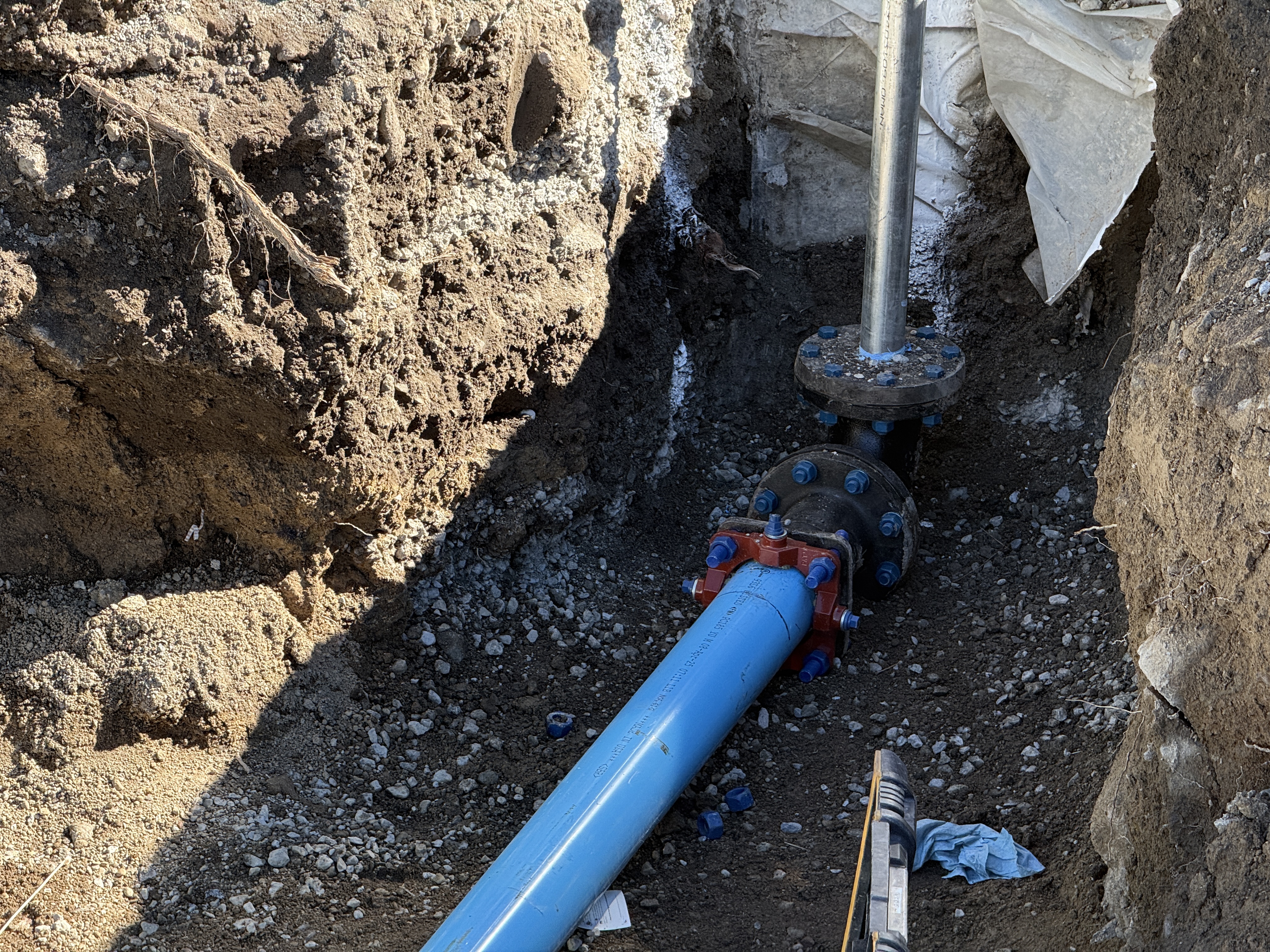 The image shows a blue pipeline installed in a trench, with a visible valve assembly connected to the pipe. The trench is surrounded by excavated soil and appears to be part of a larger water infrastructure project. There is a measuring level tool near the bottom of the trench. The pipeline and valve assembly suggest ongoing work in the installation phase of a water distribution system.