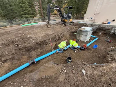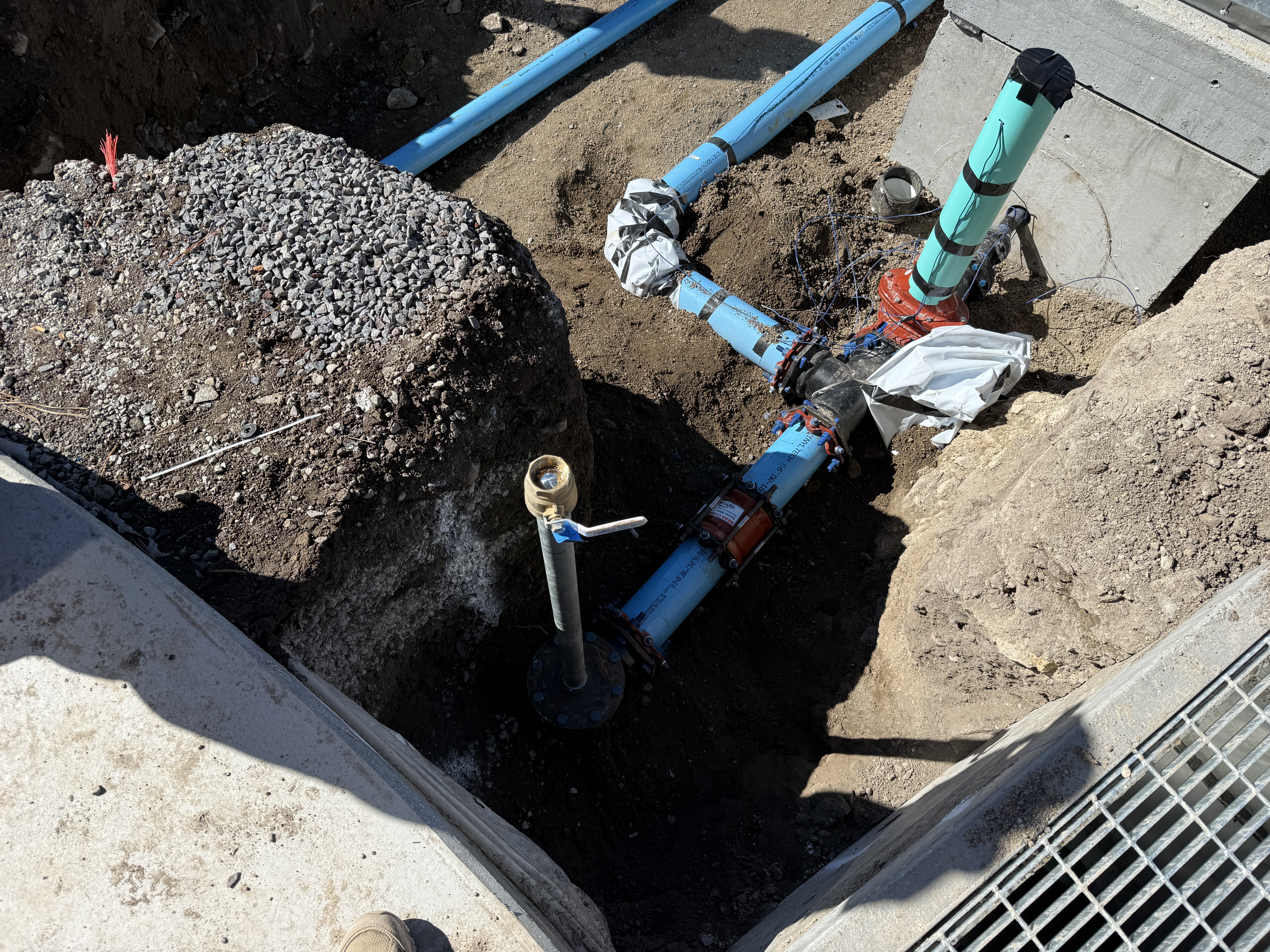The image shows underground installation work featuring blue pipes connected to a red valve assembly with several joints visible. The installation is taking place within a pit, surrounded by soil and gravel. A metallic vertical pipe protrudes from the ground with a fitting on top. Light construction equipment or vehicles are not visible.