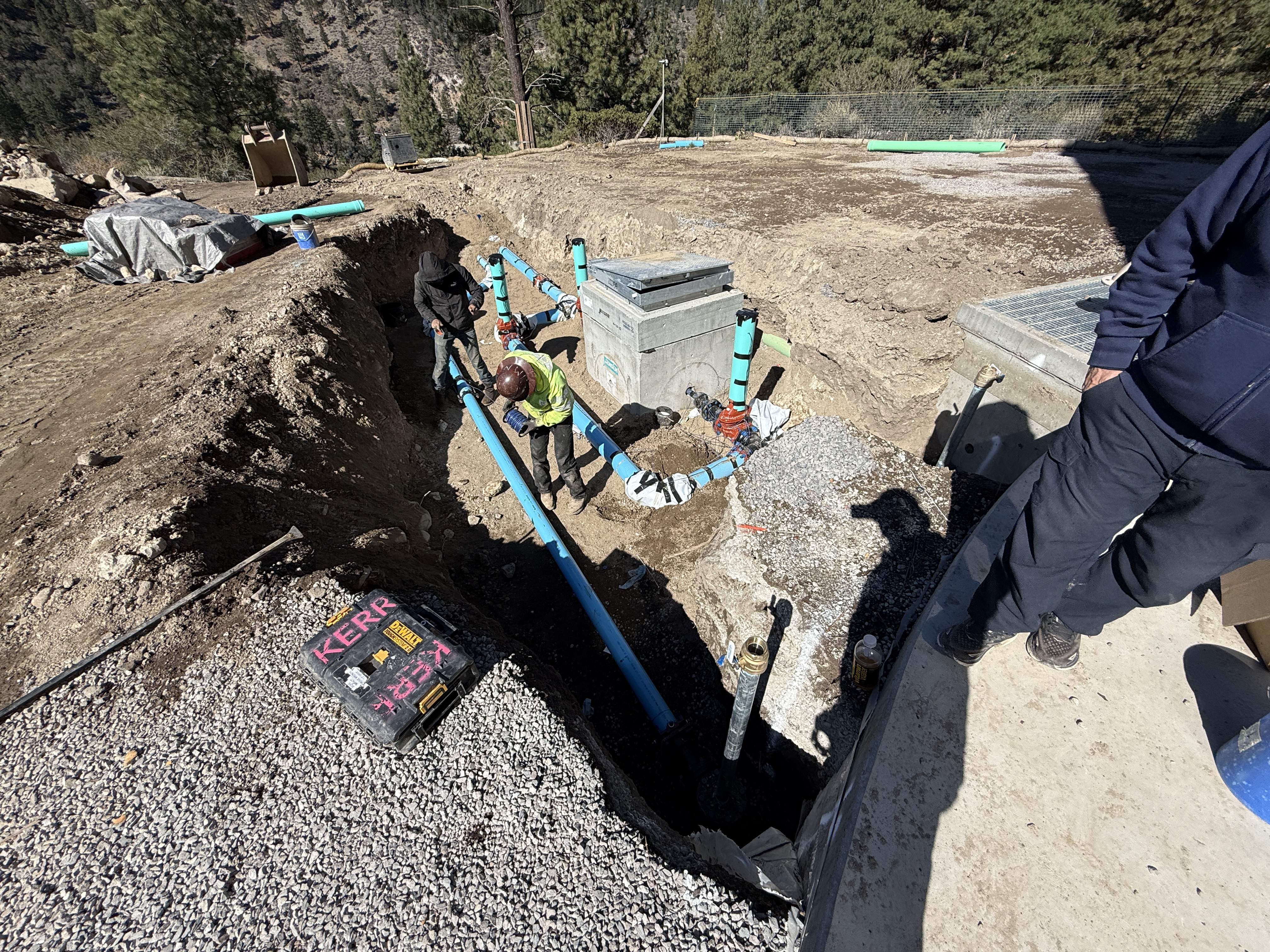The image shows two workers inside a trench connecting blue piping sections near valve vaults. Valve boxes are visible in the trench area, and the perimeter is lined with gravel backfill. The environment appears to be a mountainous terrain with excavated earth around the work area. A tool case marked 'KERR' is seen nearby, possibly containing necessary tools for the installation.