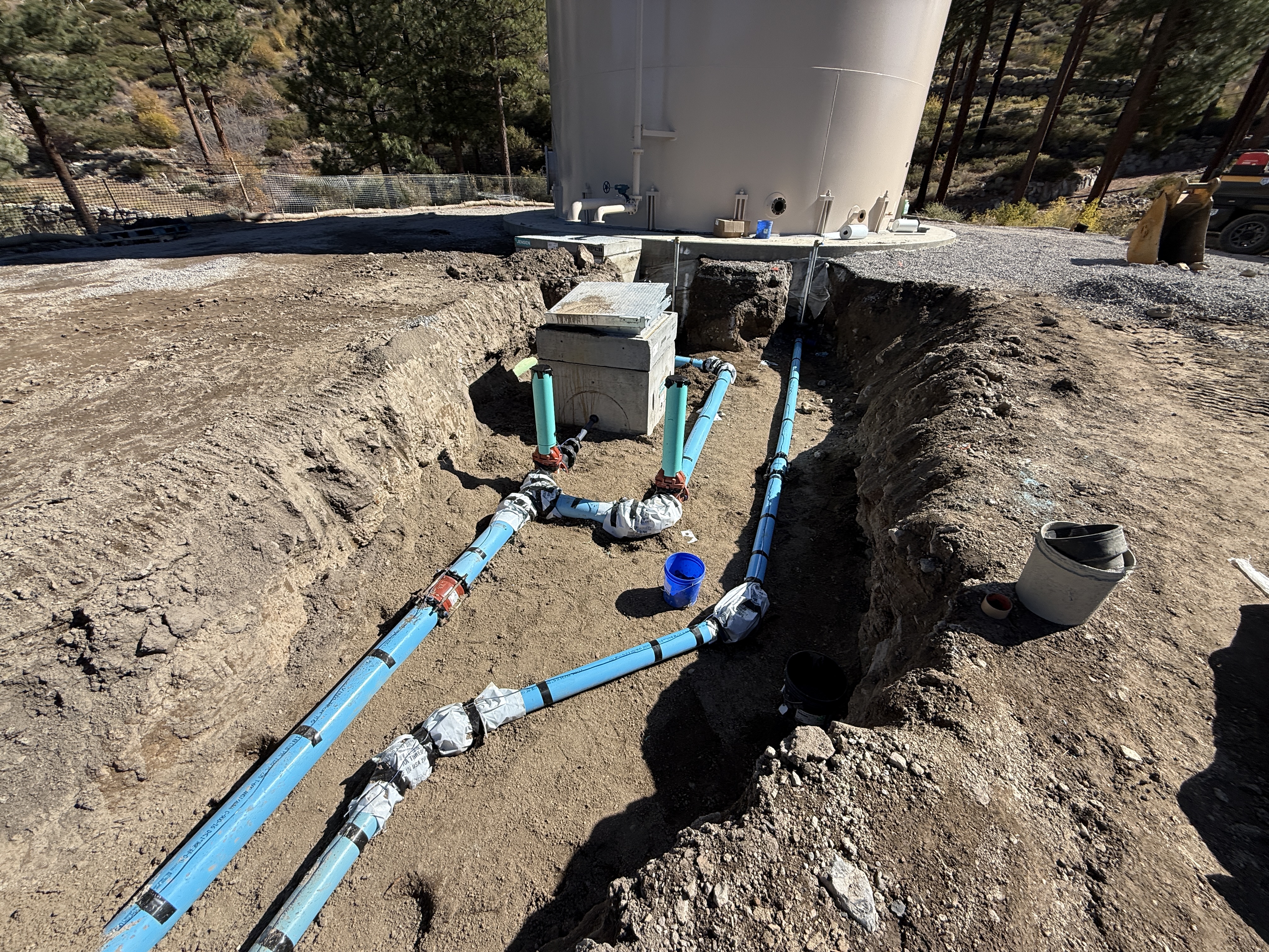 The image shows a dug trench with blue pipelines being installed near a large finished water tank. Several joints and valves appear to be in place, with a flow meter valve vault positioned centrally. Some buckets and construction materials are scattered on-site. The surrounding area is a dirt and gravel surface with trees in the distance.