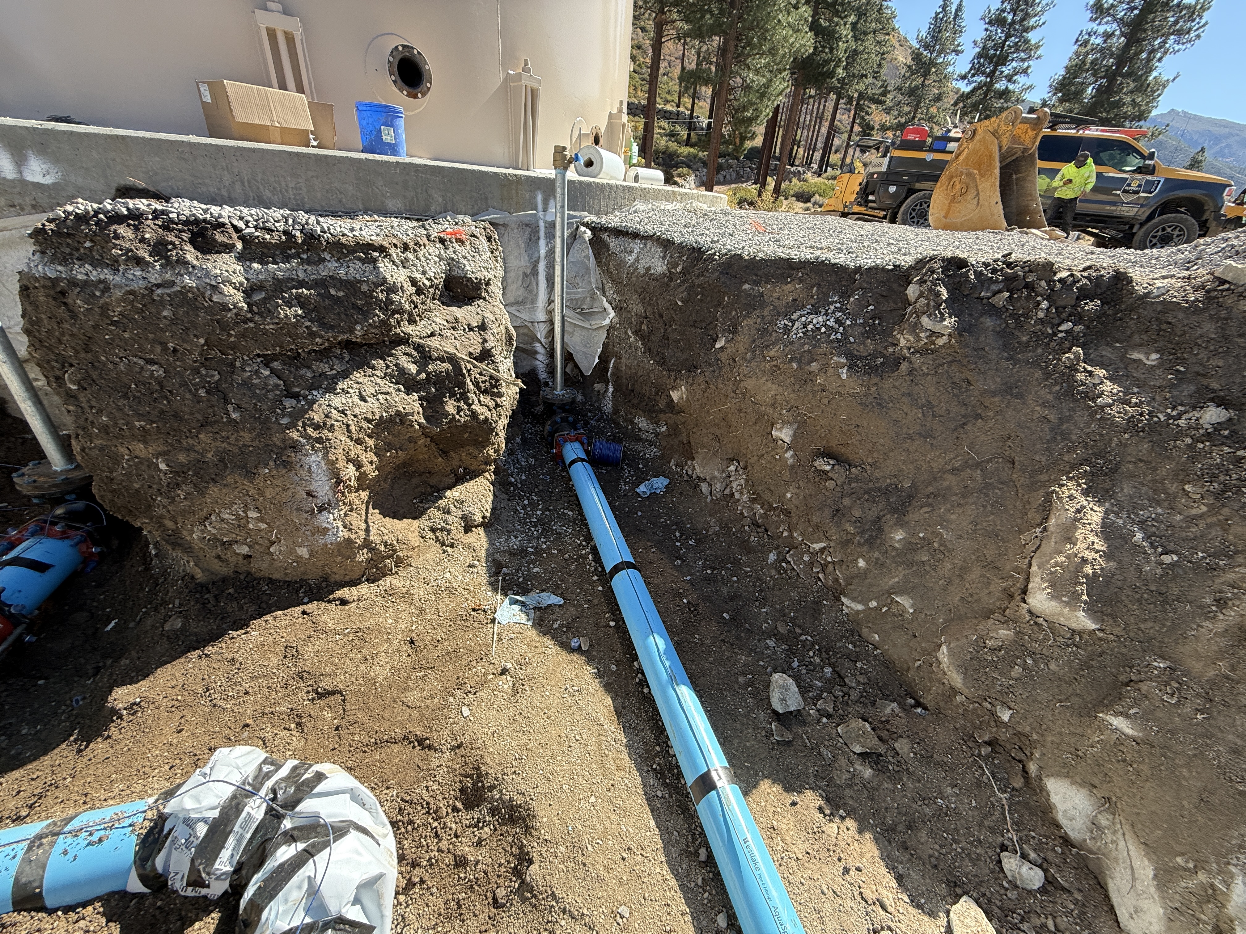 The image shows a section of trenching work near a water tank where blue pipes are visibly installed or staged in a cut trench. The site appears to be an excavation with surrounding soil and debris. There's a construction vehicle and personnel in the background, indicating active work. The focus is on trenching and pipe installation near the finished water tank area.