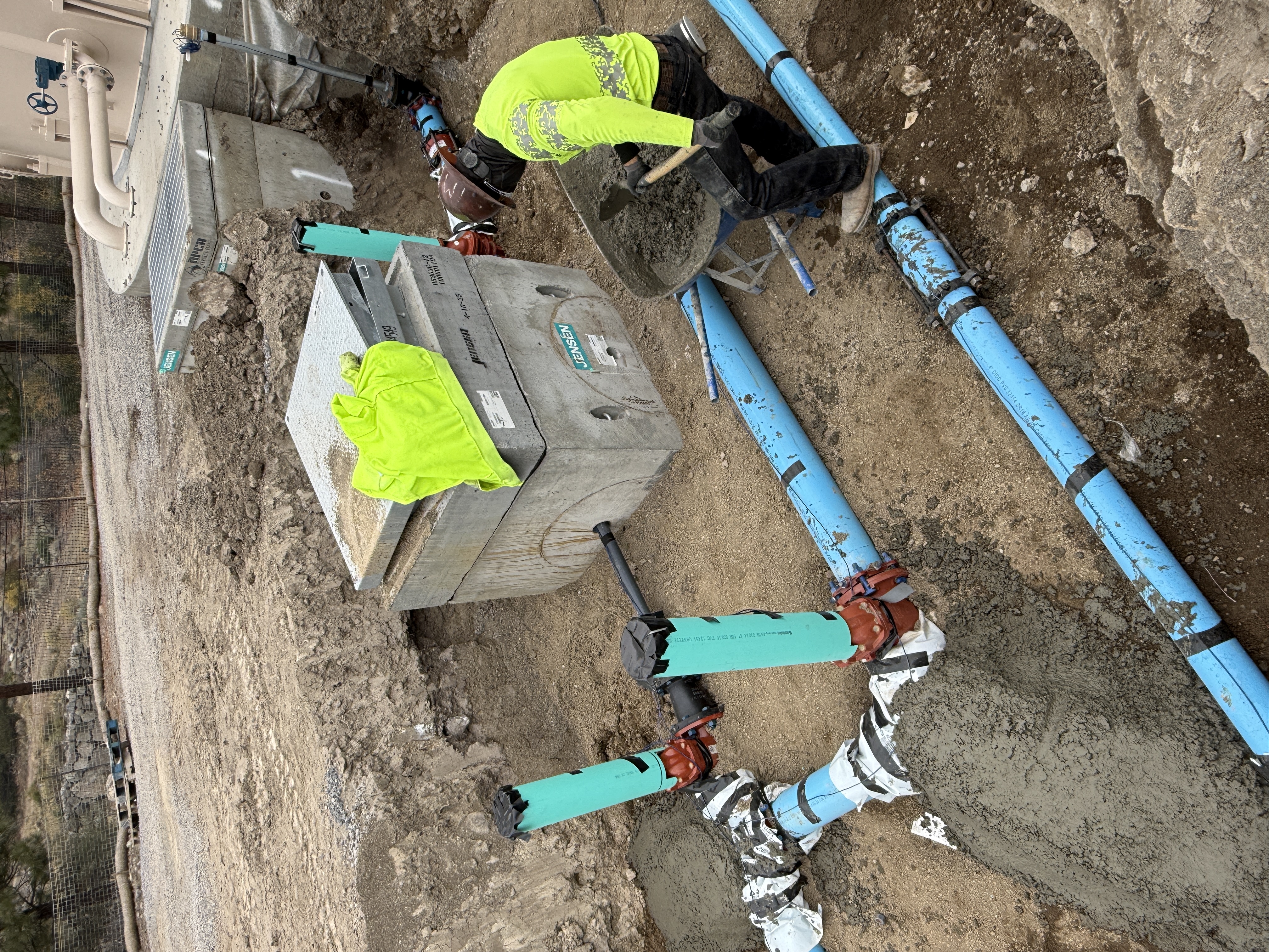 The image shows a construction site where a worker is handling concrete around blue pipelines connected to a valve vault. A concrete vault is centrally located, with pipes leading into it and another vault visible in the background. The worker is wearing a hard hat, high-visibility clothing, and work boots while working with a tool on the trench floor. Surrounding the area are open trenches and a fence perimeter.
