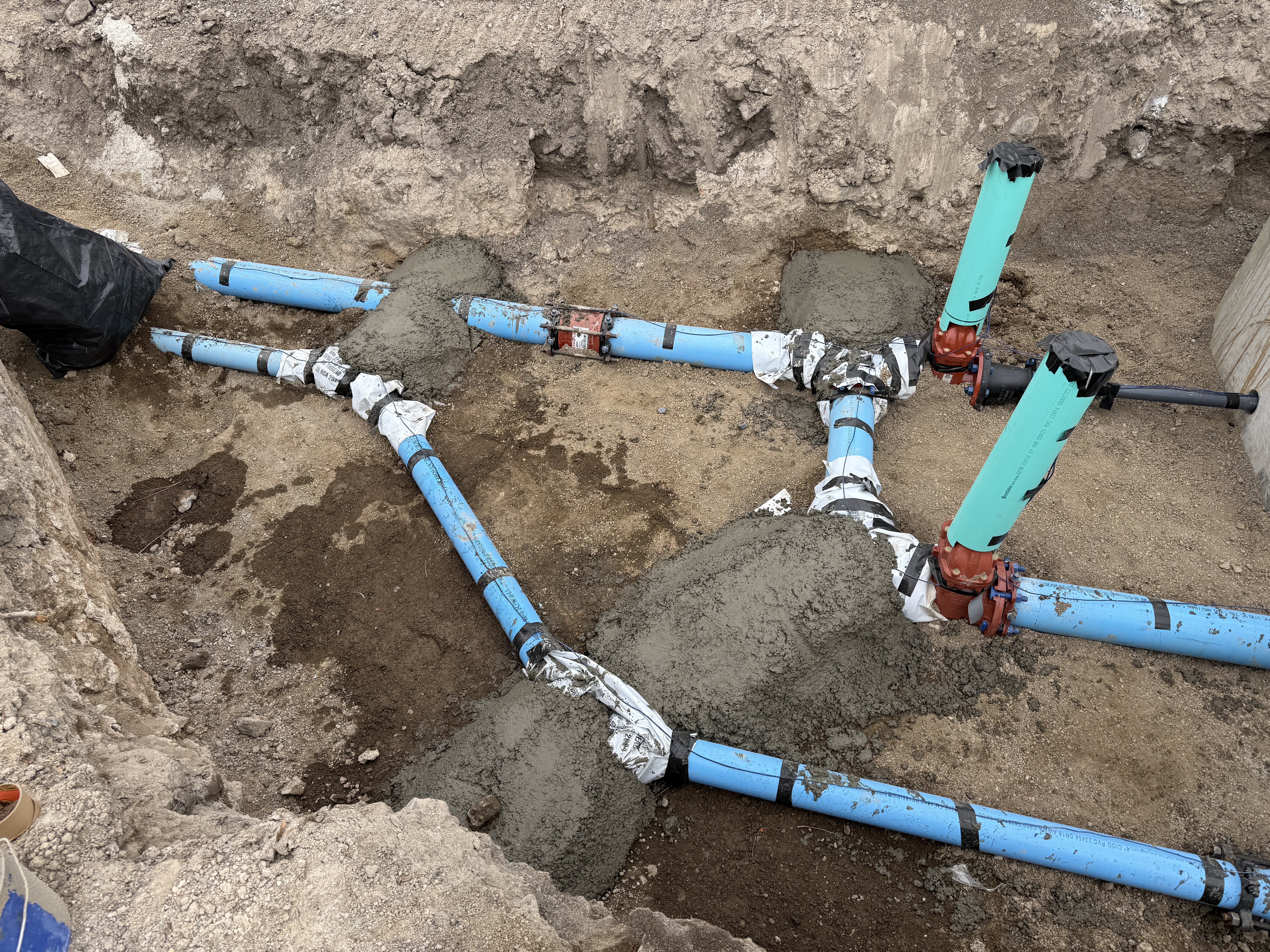 The image shows a network of blue pipes being installed in an excavated area. These pipes are joined at several points, marked by concrete encasements. Protective wraps are applied at pipe joints and a few vertical components are present, possibly indicating connections or future extensions. The surrounding soil is excavated to allow for this installation.