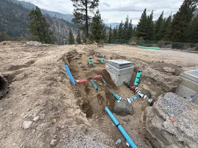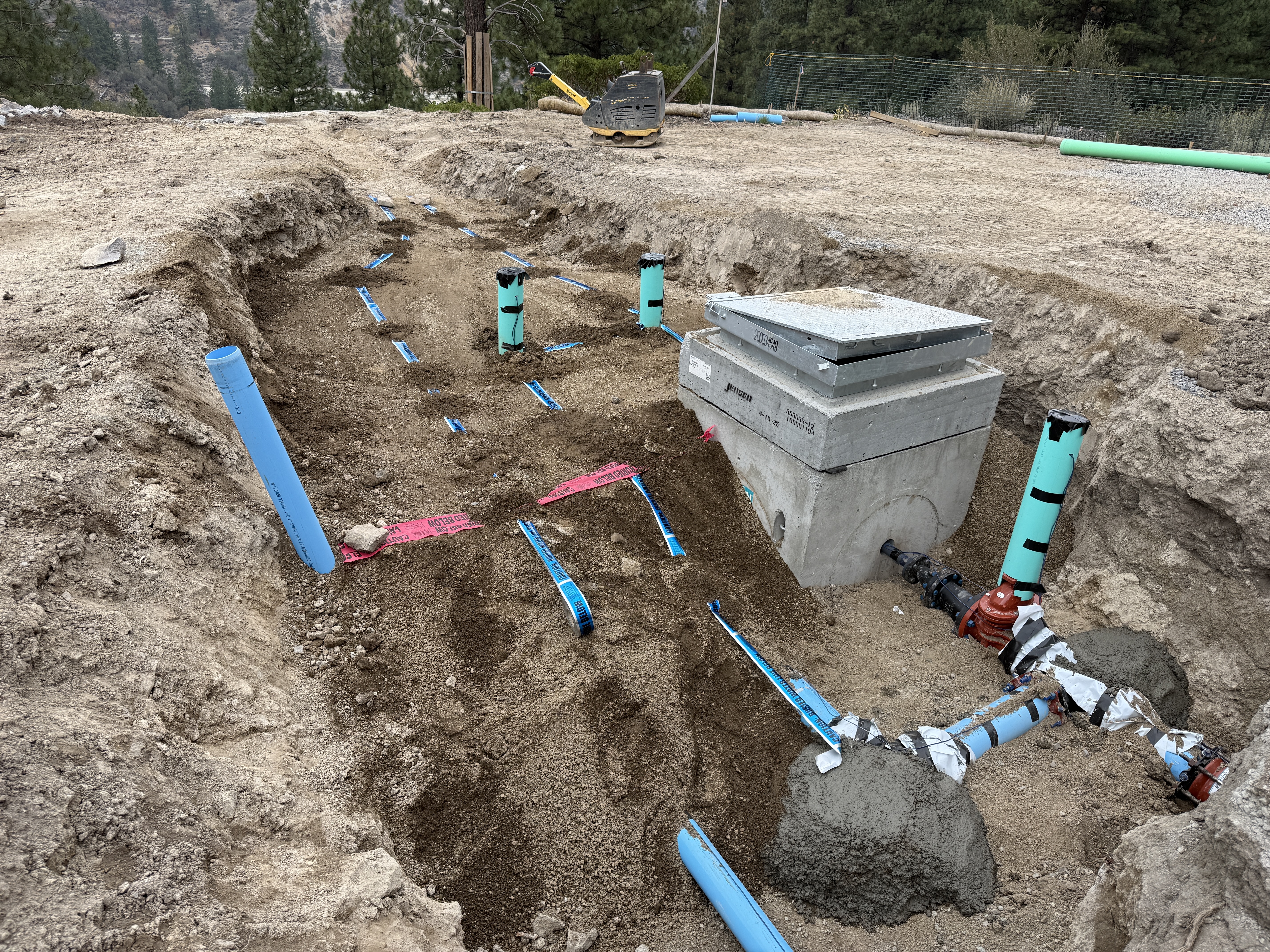 The image depicts an open trench on a construction site with several blue and green pipes being installed. A concrete valve vault is positioned in the trench, and some pipes are partially encased in concrete. Pink warning tape is also visible, demarcating certain areas. Surrounding soil indicates ongoing trench preparation.