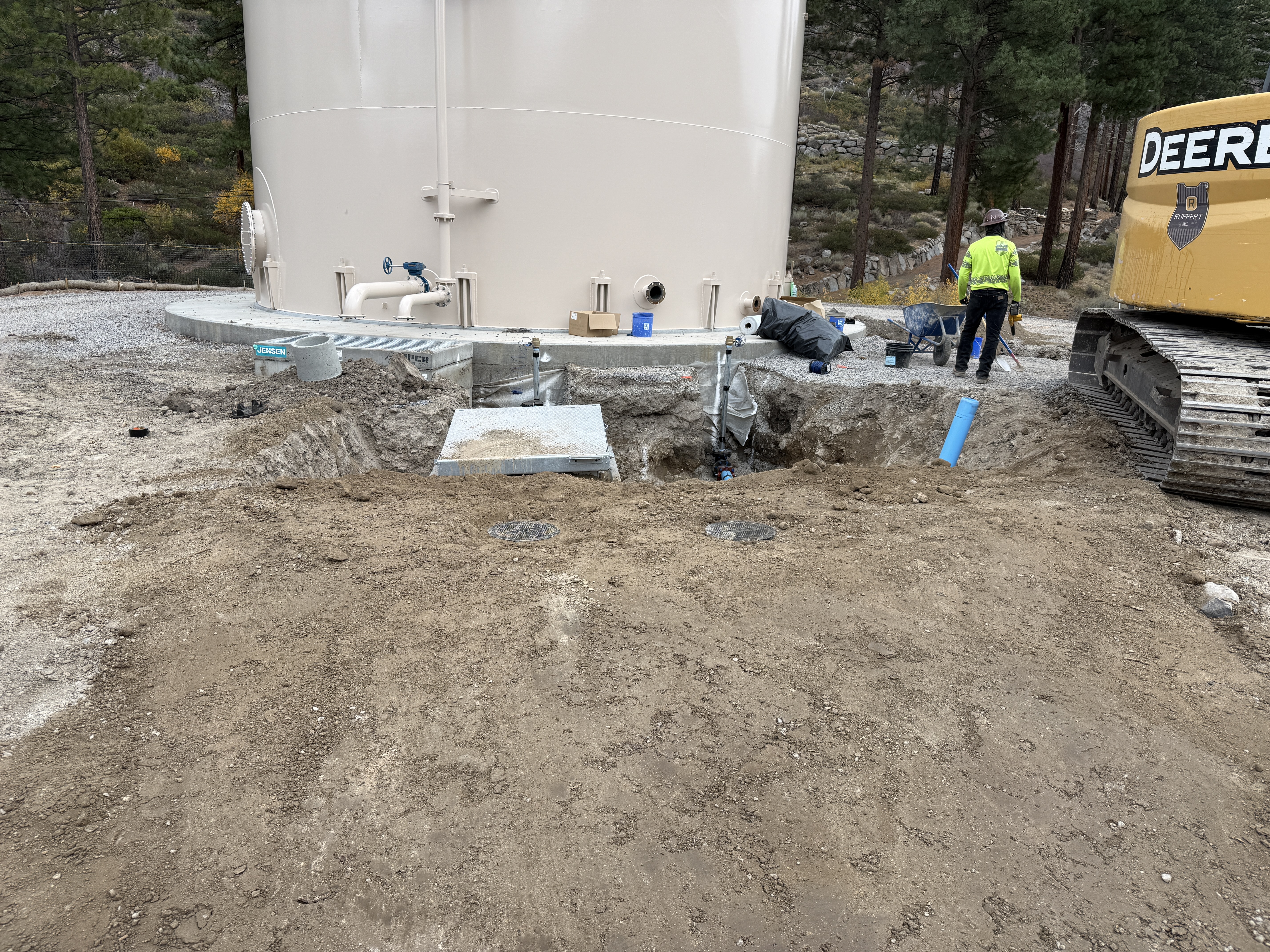 The image shows an excavation site near a finished water tank. A person in a hi-vis vest and hard hat is working next to a trench, with a large excavator positioned nearby. A valve vault is visible in the trench, and several pipes are positioned around the excavation. The weather appears overcast, and the area is surrounded by trees.