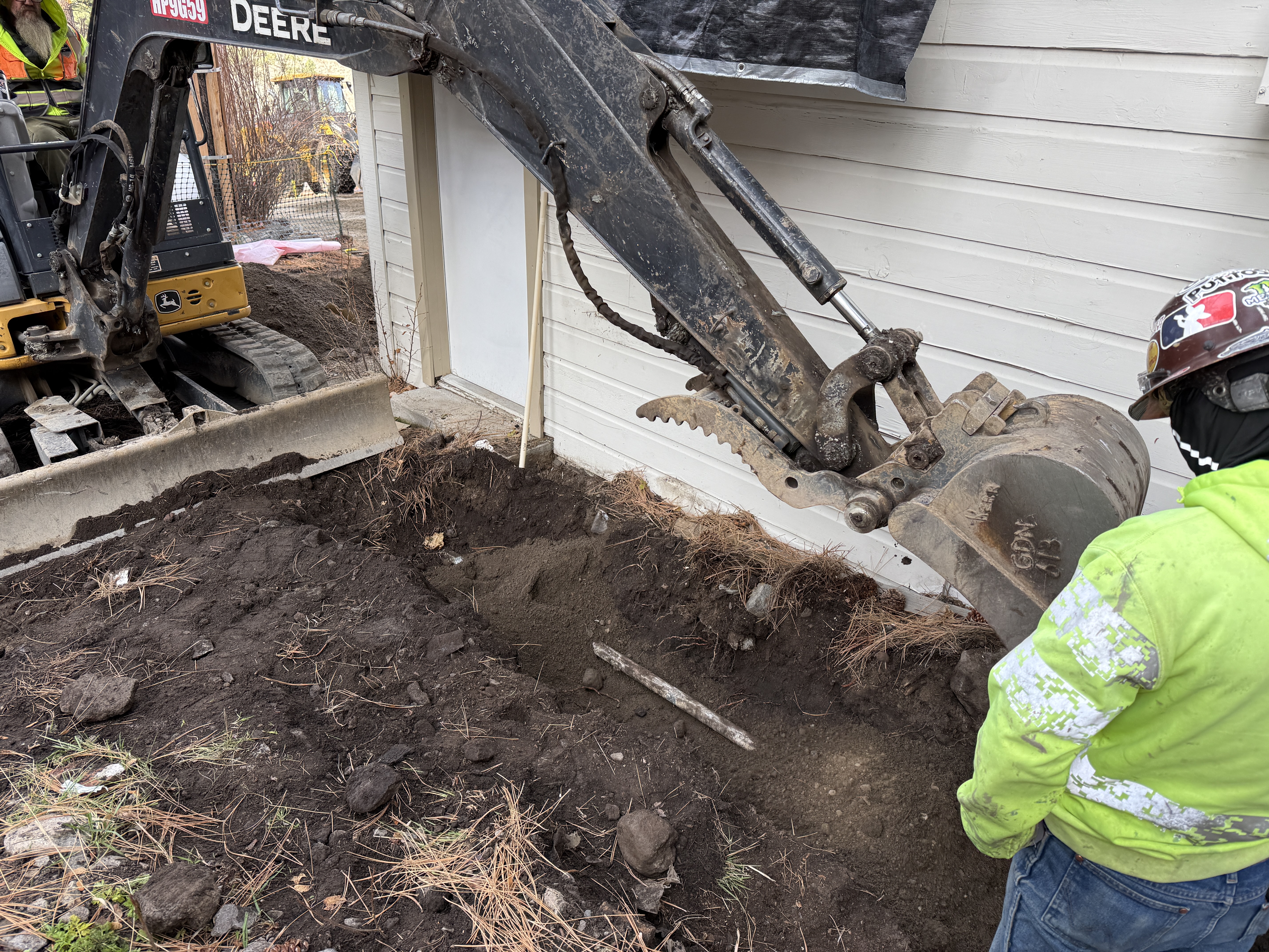 The photo shows an excavator digging a trench alongside a building foundation. A construction worker in hi-vis clothing observes the excavation process. The ground appears to be a mix of soil and some rocks. The trench is located directly adjacent to a white wooden building wall.