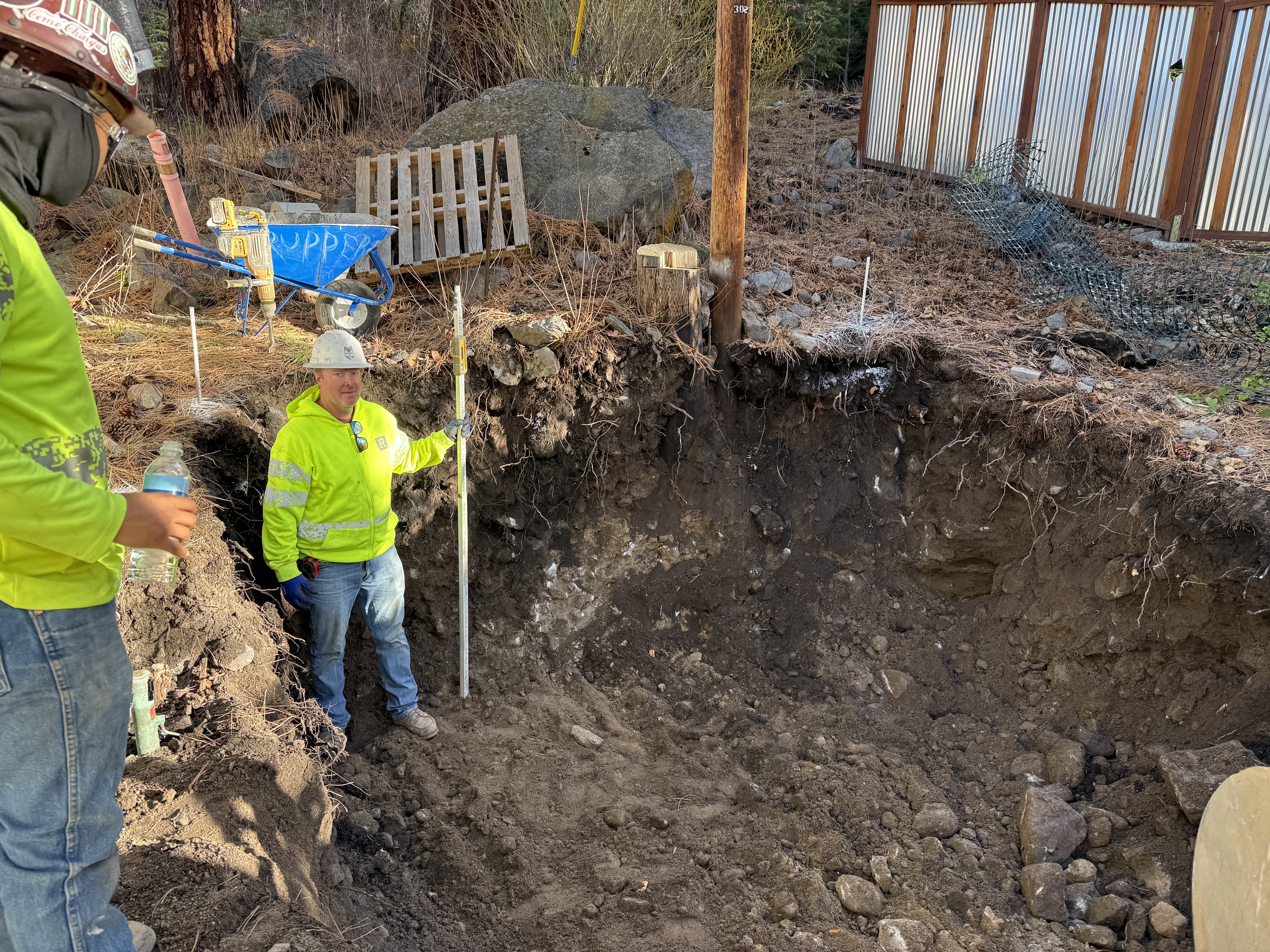The image shows an excavation area where one person is standing inside an open trench holding a measuring rod. Another person is visible outside the trench holding a water bottle. The trench walls reveal soil and rocks. A wheelbarrow and wooden pallet are present near the trench, indicating site preparation or cleanup activities.