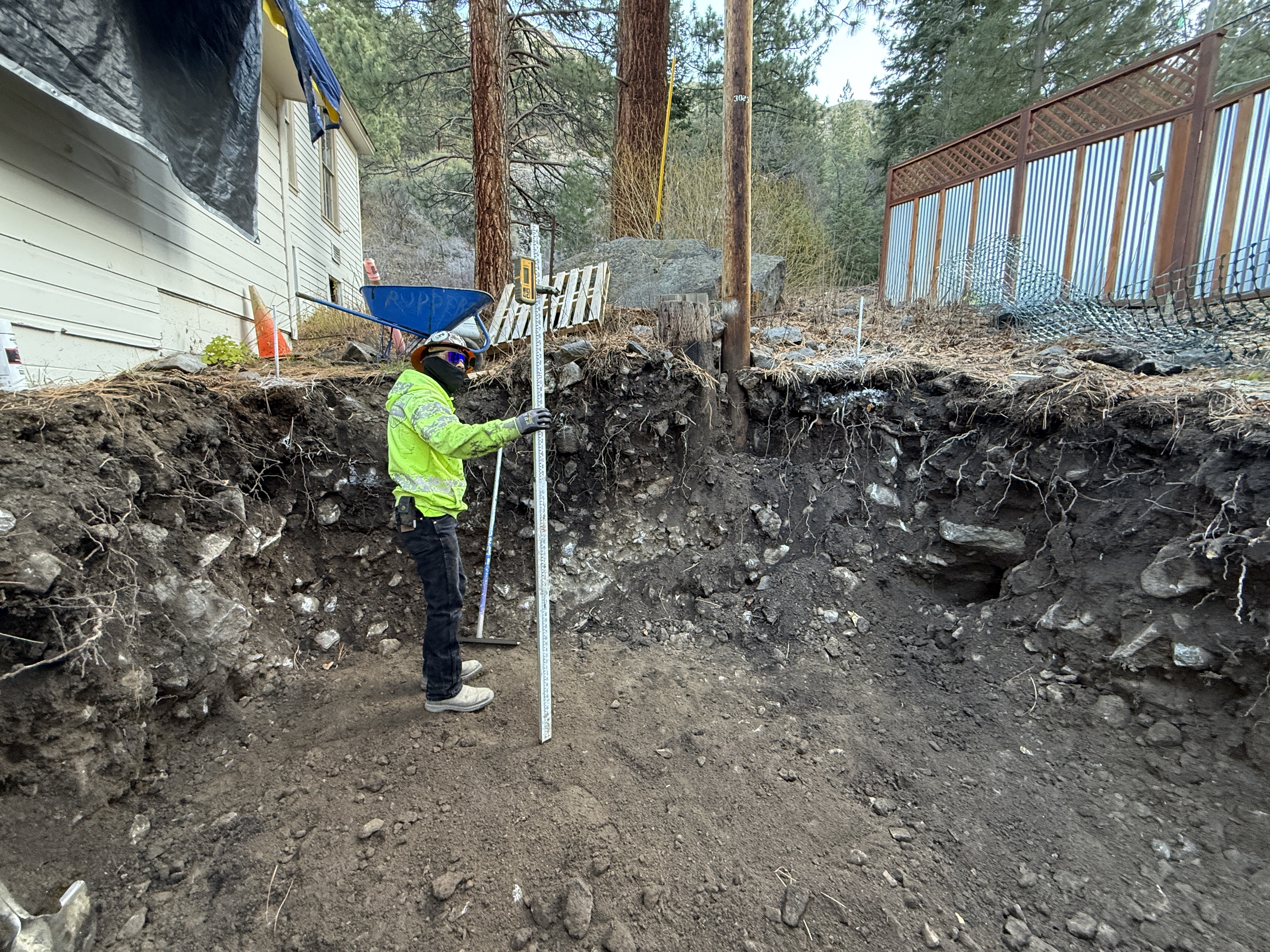 A person in PPE is using surveying equipment in a deep excavated pit next to a building. A level rod is being held vertically, suggesting measurement or layout activities. The surrounding environment includes exposed soil and rocks with visible roots.