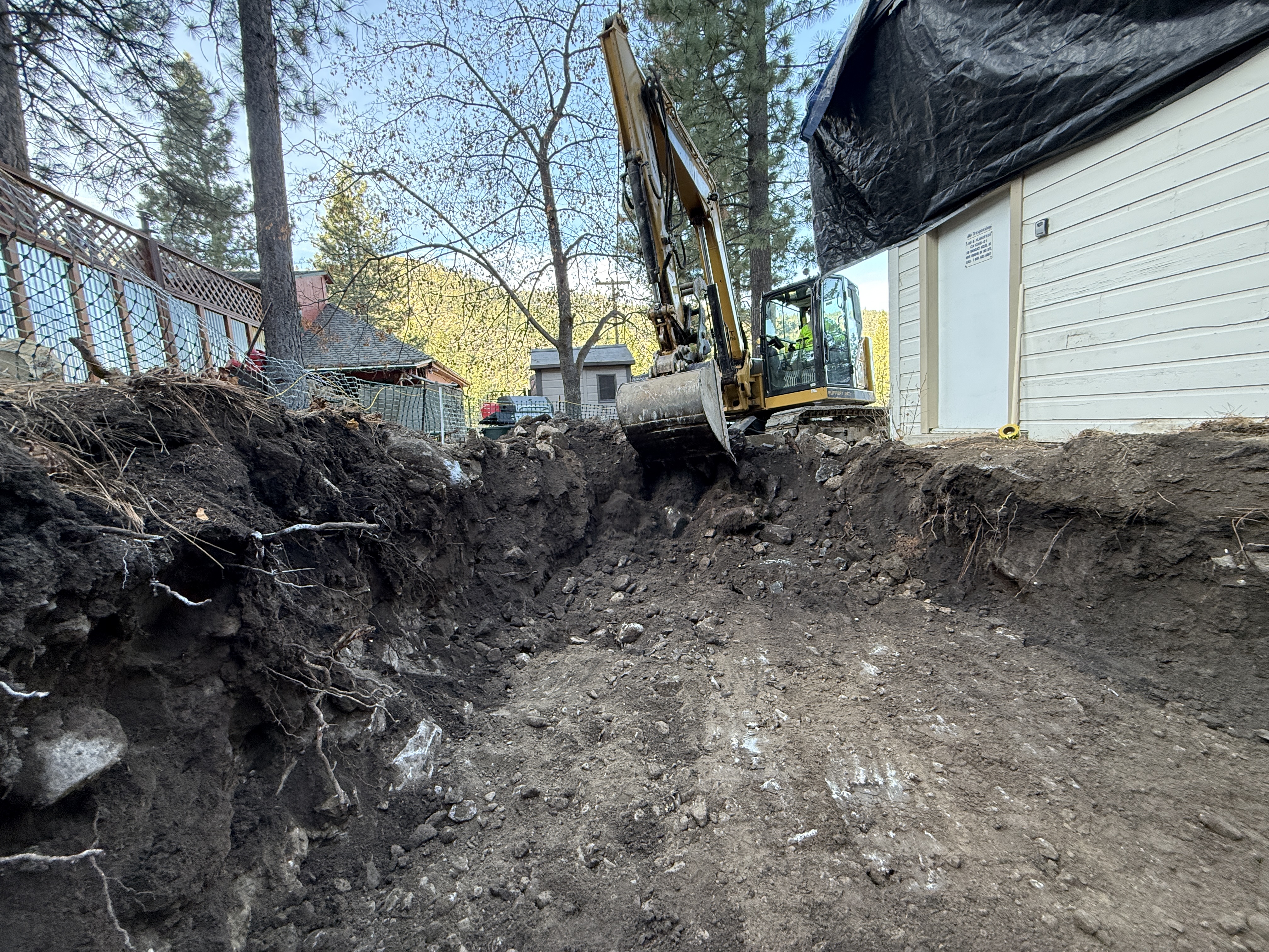 The image features an excavator actively digging a trench near a white building with a black tarp on the roof. The trench appears to be freshly dug, with soil and roots exposed along the sides. There are trees and a fence visible in the background.