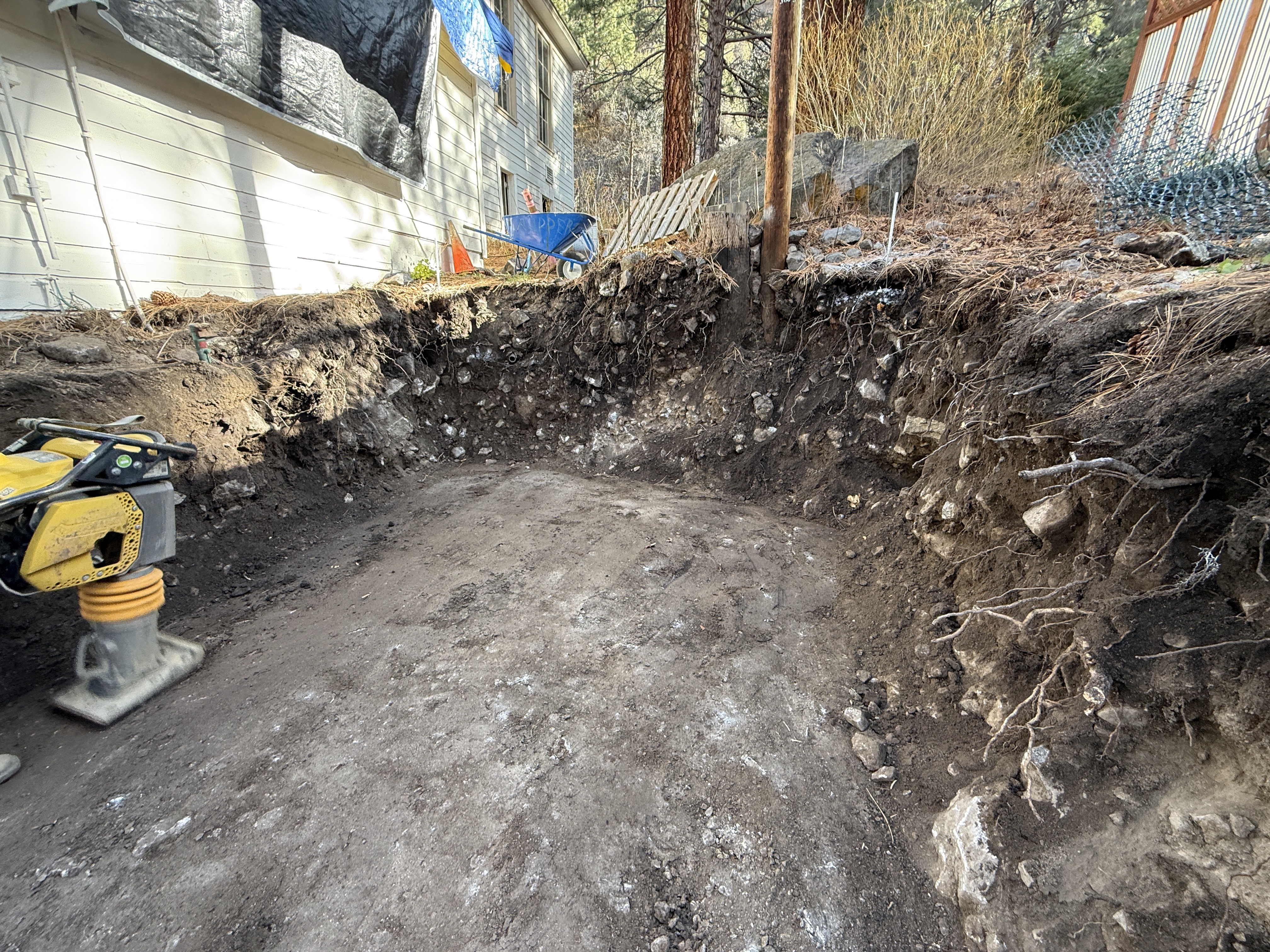 exposed soil with roots and small rocks daylight with no adverse weather visible limited access with equipment and materials adjacent to building