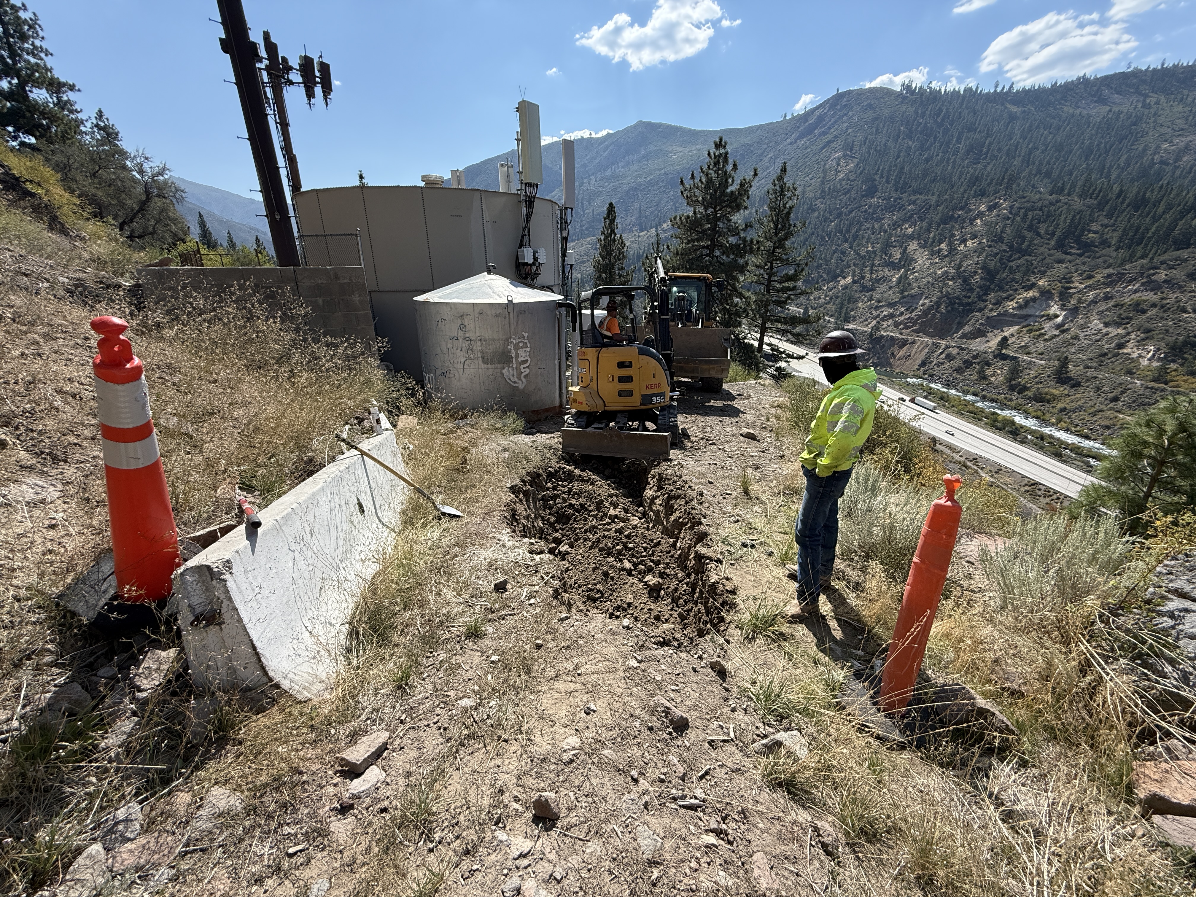 soil and rocky slope near roadway sunny and clear open access with visible excavation and safety cones