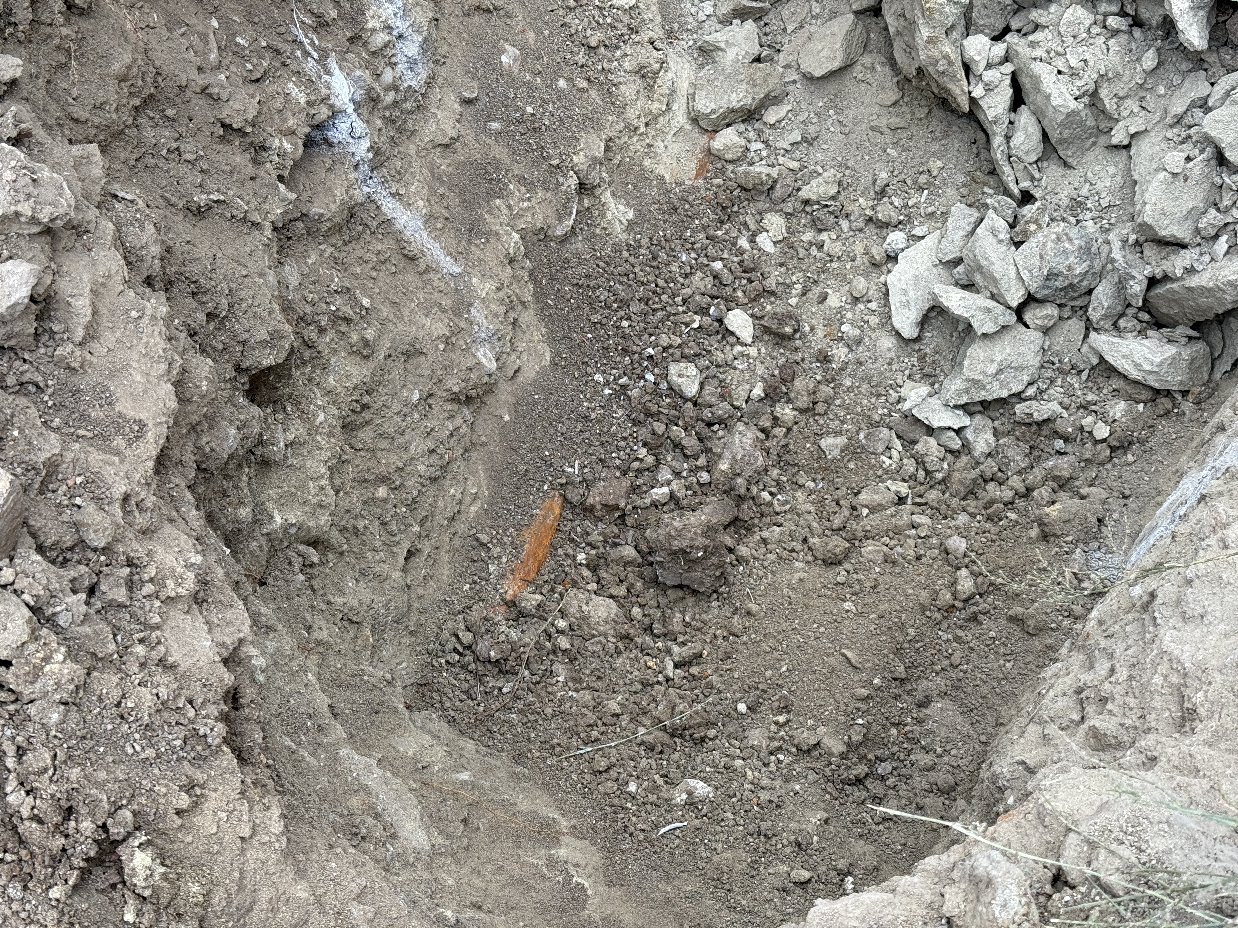The image displays an excavation area with exposed soil and rocks. The soil appears disturbed, indicating recent digging activity. There is no visible water presence, equipment, or personnel. The environment appears dry and rocky, with no safety barriers or controls in place.