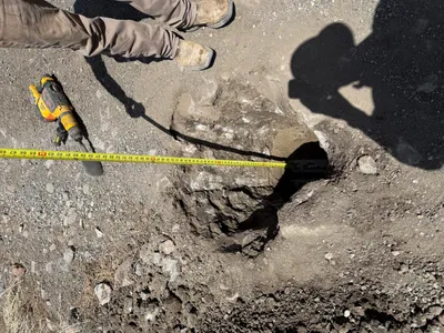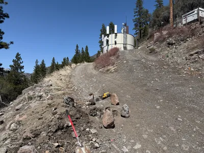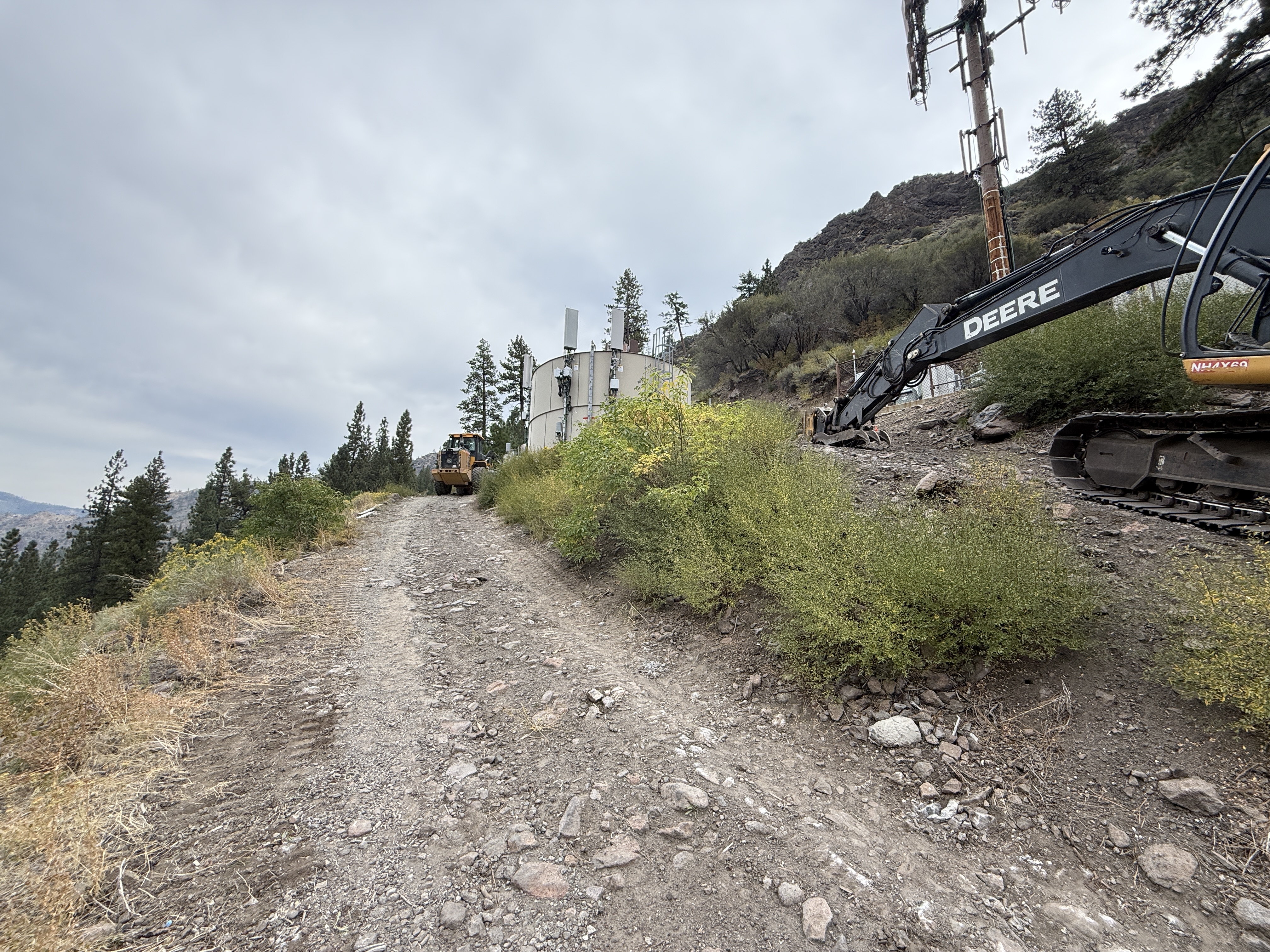 The image shows a dirt road leading to a raw water tank with heavy equipment parked nearby. A heavy excavator is present on the right side of the image. Another piece of machinery is located further up the road. The road surface is rocky and uneven, and the setting appears to be in a forested mountain area.