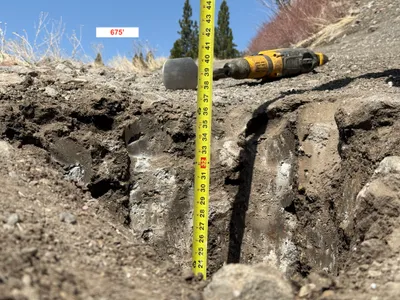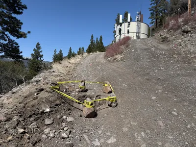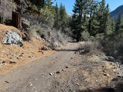 dirt and rock road overcast sky, diffused lighting equipment parked on access road