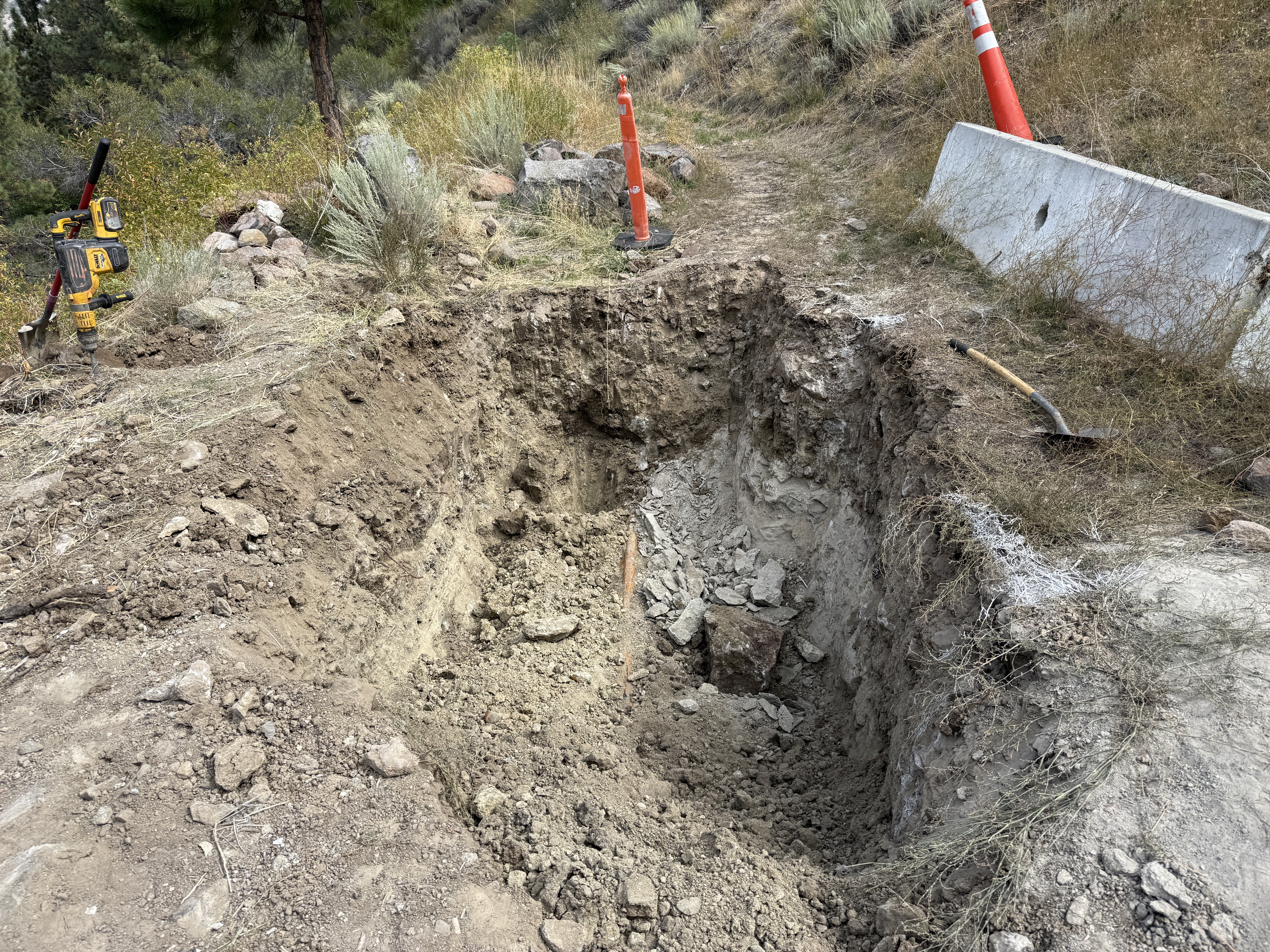 The image shows a deep excavation pit with irregular edges. A laser level and a shovel are positioned near the pit edge, indicating ongoing excavation work. A row of rocks and dirt is seen at the back, suggesting recent digging activity. Safety cones and a concrete barrier are positioned to the side, providing some form of site control.