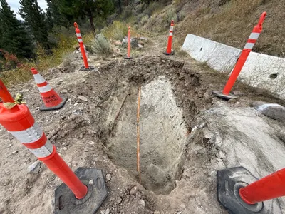 Traffic cones serve as the primary control, outlining the hazard of the open trench.