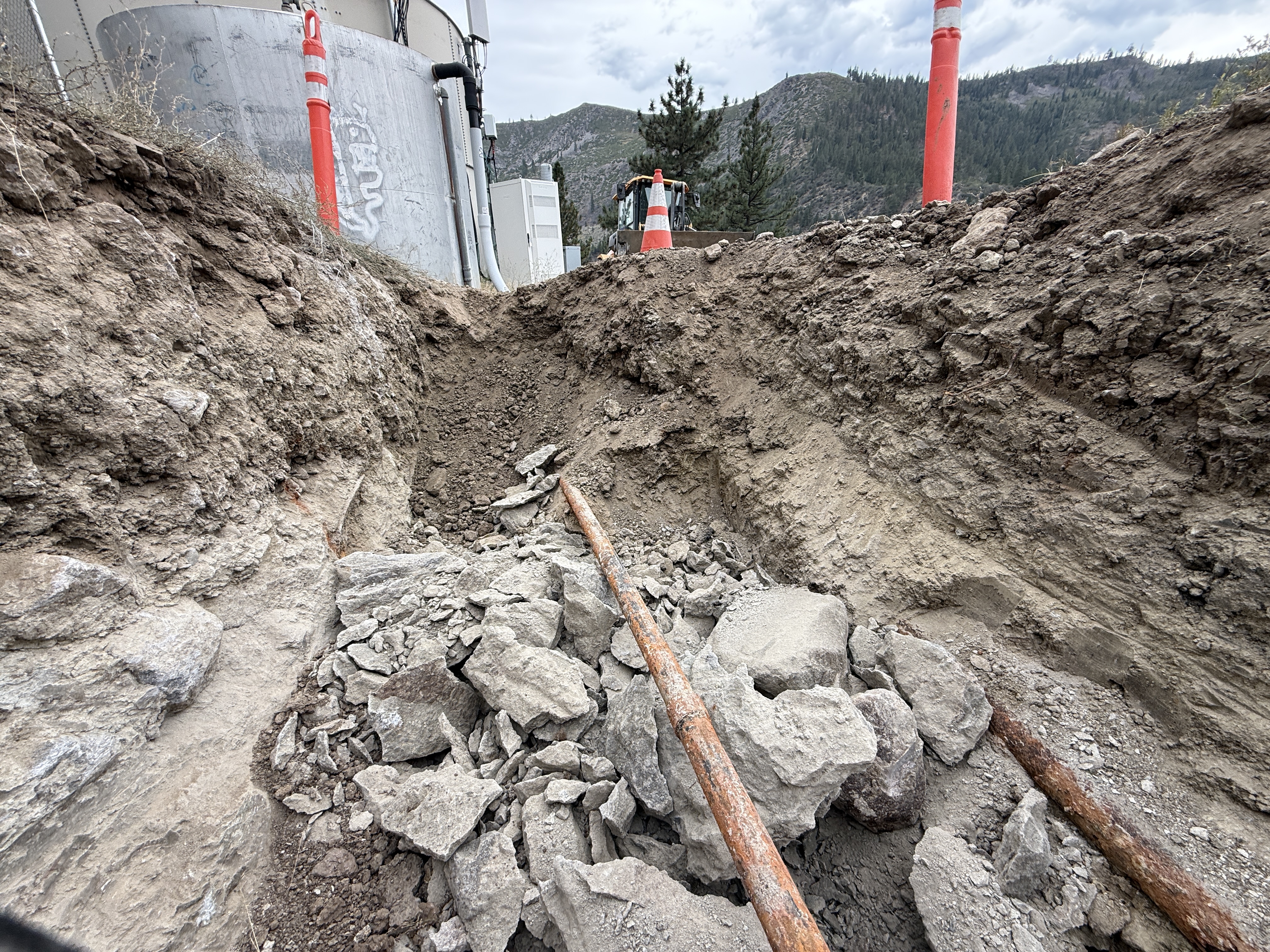 The image shows a trench being excavated near a large cylindrical tank identified by labeling as a raw water tank. In the trench, loose rocks and soil are present, with a couple of visible wooden logs or pipes. The area is marked with bright orange construction cones indicating safety controls. Some background forestation and hills are visible, suggesting an outdoor construction site.