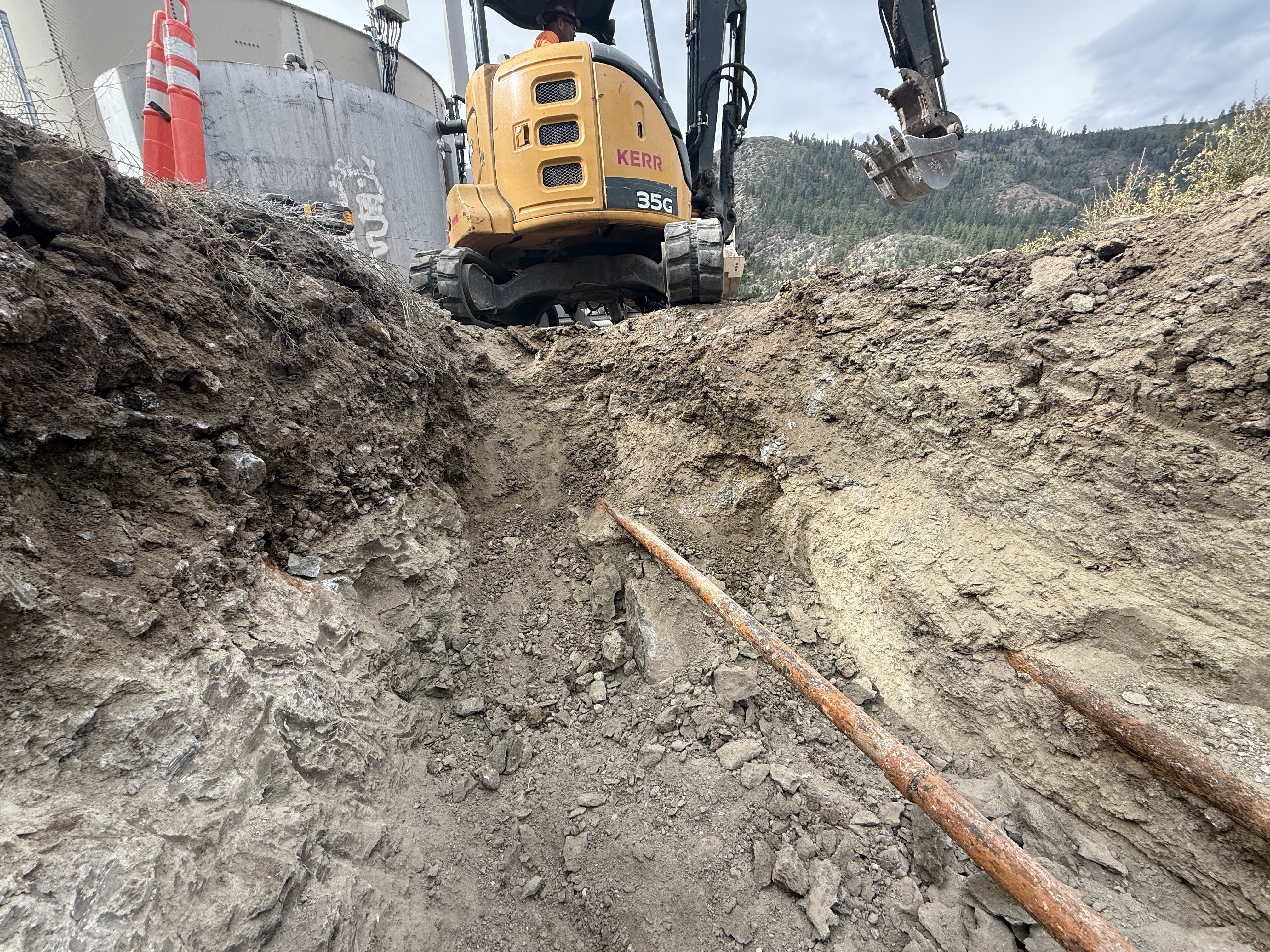 The image shows an excavator working on trenching near a raw water tank. Two exposed pipes are visible in the ground at the bottom of the trench. The excavator is positioned at the edge of the trench with its arm extended. Soil and some rocky layers are visible in the trench walls. Orange cones are placed near the tank, possibly for safety or marking purposes.